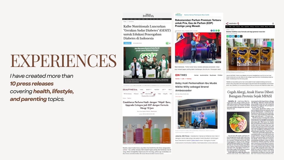 Jasa KOL Management & Press Release Writing Saya membantu brand mengelola campaign KOL secara menyeluruh mulai dari pemilihan, handling KOL, hingga insight content post. Selain itu, saya juga menawarkan jasa penulisan press release yang sesuai gaya komunikasi brand untuk mendukung publikasi dan eksposur di media.