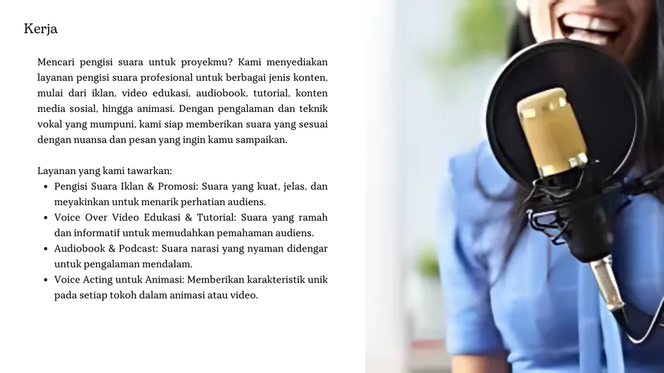 Mencari pengisi suara untuk proyekmu? Kami menyediakan layanan pengisi suara profesional untuk berbagai jenis konten, mulai dari iklan, video edukasi, audiobook, tutorial, konten media sosial, hingga animasi. Dengan pengalaman dan teknik vokal yang mumpuni, kami siap memberikan suara yang sesuai dengan nuansa dan pesan yang ingin kamu sampaikan. Layanan yang kami tawarkan: Pengisi Suara Iklan & Promosi: Suara yang kuat, jelas, dan meyakinkan untuk menarik perhatian audiens. Voice Over Video Edukasi & Tutorial: Suara yang ramah dan informatif untuk memudahkan pemahaman audiens. Audiobook & Podcast: Suara narasi yang nyaman didengar untuk pengalaman mendalam. Voice Acting untuk Animasi: Memberikan karakteristik unik pada setiap tokoh dalam animasi atau video. Kenapa Memilih Kami? Suara Berkualitas Tinggi: Suara jelas, natural, dan disesuaikan dengan kebutuhan proyekmu. Proses Cepat dan Profesional: Rekaman dan pengeditan suara dilakukan dengan kualitas terbaik dalam waktu yang efisien. Beragam Pilihan Suara: Dari suara lembut, tegas, hingga humoris, sesuai dengan karakter yang diinginkan. Harga Kompetitif: Jasa pengisi suara profesional dengan harga yang ramah di kantong. Langkah Pekerjaan 1. Memilih paket yang anda inginkan 2. Memberikan briefing dan sampaikan jenis suara yang ingin dibuatkan 3. Memberikan revisi (jika ada revisi yang perlu ditambahkan)