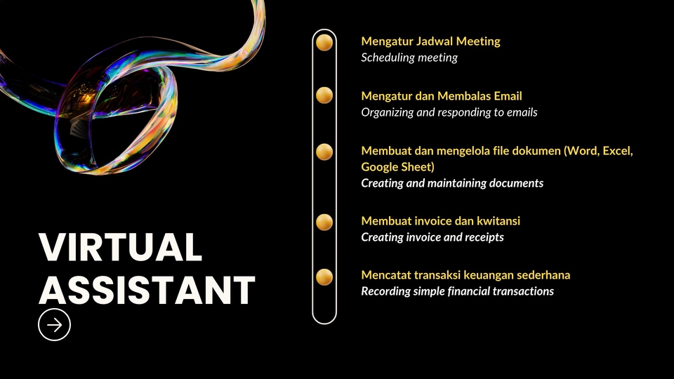 Virtual assistant membantu menyelesaikan pekerjaan tanpa harus di kantor. mampu mengerjakan administratif, customer service, e-commerce support untuk input stok, produk dan deskripsi produk, bersedia menjadi personal assistant untuk mengatur jadwal, meningkatkan jadwal pribadi, dan menyusu rencana kegiatan.