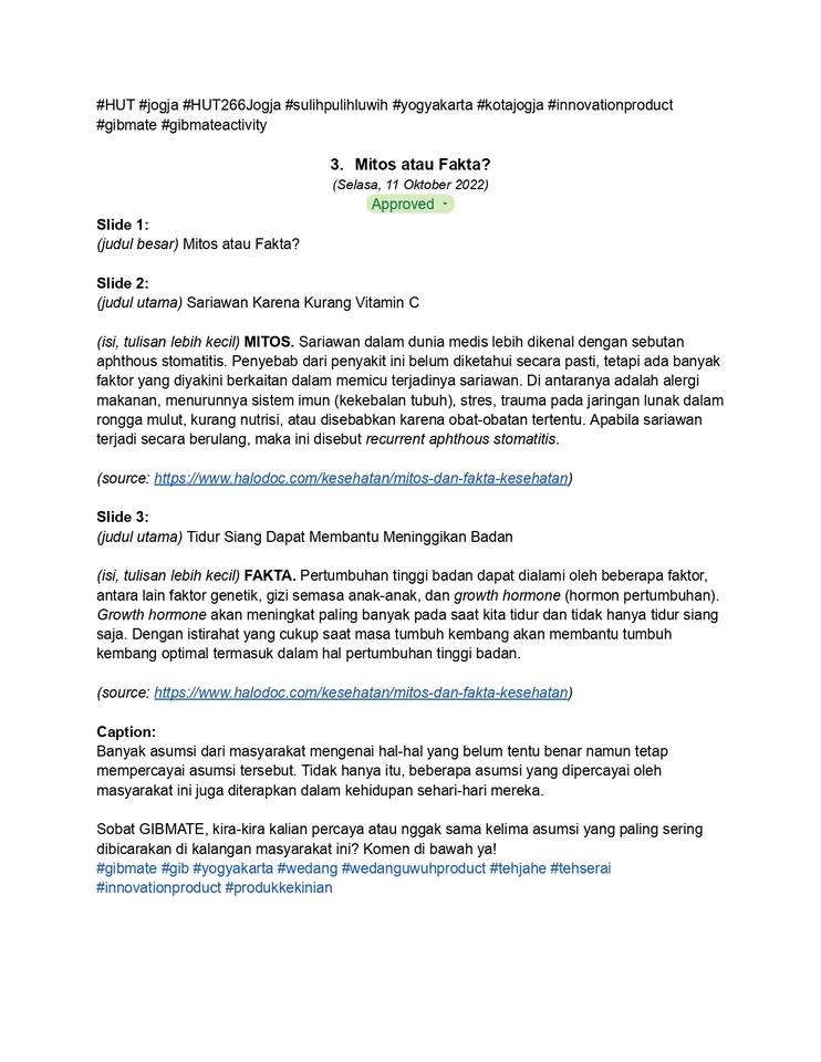 Rp50,0 rbKonten yang akan dihasilkan: - 1 content writing - Berlaku untuk 1 ide konten - Isi konten jika direalisasikan secara visual akan memuat 1-5 slide - Sudah termasuk caption