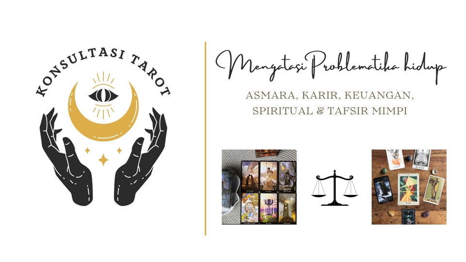 Kami Menyediakan jasa konsultasi dengan media kartu tarot untuk segala jenis problematika hidup seperti: asmara, rumah-tangga, karir, keuangan, spiritual dan tafsir mimpi. Pembacaan kartu tarot secara detail, komunikatif dan interaktif sesuai dengan realita yang sedang anda hadapi. Langkah Pekerjaan 1. Ajukan permasalahan yang ingin ditanyakan kepada tarot reader. Privasi dijamin aman 2. Tarot reader akan membacakan hasil kartu, sekaligus melakukan diskusi dengan client terkait hasil bacaan kartu tarotnya