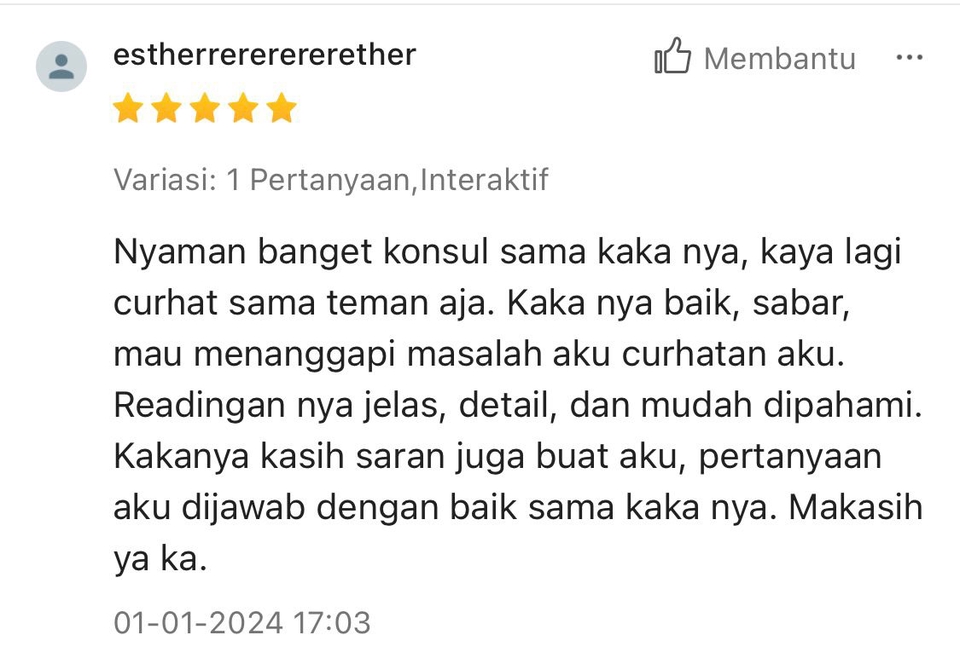 Saya seorang Tarot Reader yang sudah melayani hampir 1000 client secara online. Saya melayani konsultasi seputar problematika hidup, asmara, keuangan, karir dan kesehatan. Selain itu saya juga memiliki kemampuan untuk membaca aspek spiritual dan tafsir mimpi melalui kartu tarot