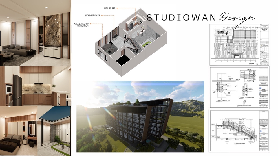 Menyediakan layanan lengkap desain interior maupun eksterior, mulai dari gambar kerja teknis (denah, potongan, tampak dll), visualisasi 3D, Animasi 3D, hingga perhitungan Rencana Anggaran Biaya (RAB).