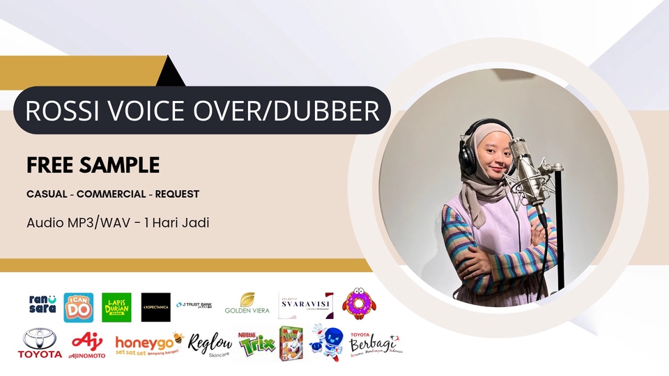 Berpengalaman sebagai broadcaster. Menyediakan jasa voice over dengan berbagai karakter sesuai kebutuhan anda. Dapat bekerja secara remote dengan peralatan profesional di rumah. Chat saya untuk berdiskusi mengenai projek anda.