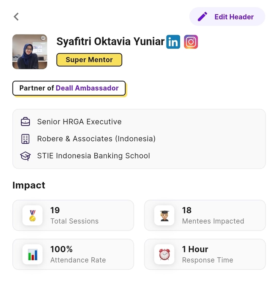 Hi, I'm Fitri! I've worked as HR for more than 4 years, and 7+ years in total experiences. I'm mostly focused in recruitment and selection, but not limited to another exposure of Human Resources. I'm very excited to share about recruiting, CV review, personal development, career planning, and personal branding as I have mentored more than 50 mentees on my personal social media platform community.