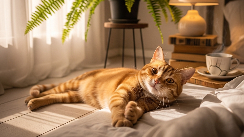 suasana kamar tidur yang nyaman dan bermandikan sinar matahari dengan seekor kucing belang merah