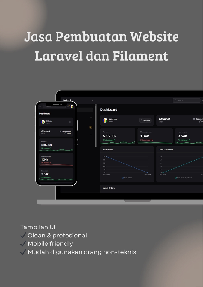 Saya menggunakan Laravel & Filament, tampilan bersih & profesional, sehingga Anda bisa: ✔ Input data lebih cepat ✔ Pantau stok otomatis ✔ Kelola produk / pesanan dengan mudah ✔ Lihat laporan kapan saja Contoh Sistem: ✔ Toko Online ✔ Toko Sembako / Retail ✔ Coffee Shop / Kuliner ✔ UMKM Kerajinan / Fashion ✔ Jasa / Freelance Tampilan UI yang Didapat ✔ Clean & profesional ✔ Mobile friendly ✔ Mudah digunakan orang non-teknis Teknologi yang Saya Gunakan ✔ Laravel 9/10/11 ✔ Filament Admin Panel ✔ MySQL / MariaDB ✔ TailwindCSS ✔ Spatie Role Permission ✔ Frontend (Blade/vue.js) Alur Kerja ✔ Diskusi kebutuhan (Gratis) ✔ Rancangan fitur & estimasi waktu ✔ Proses pengerjaan ✔ Demo & revisi ✔ Penyerahan sistem & panduan penggunaan