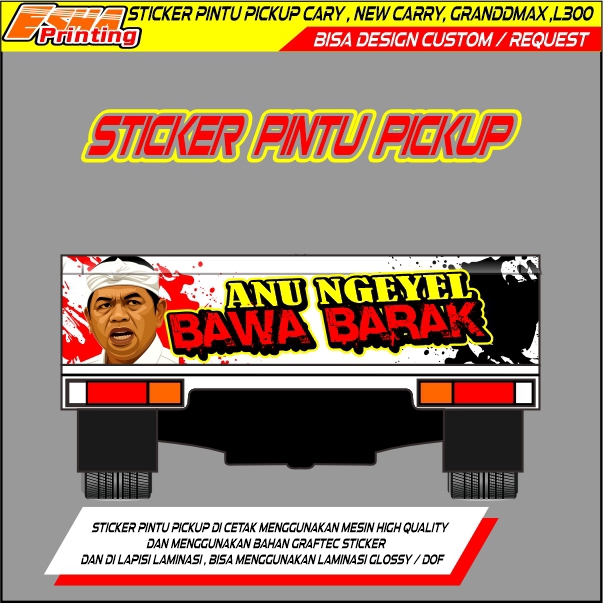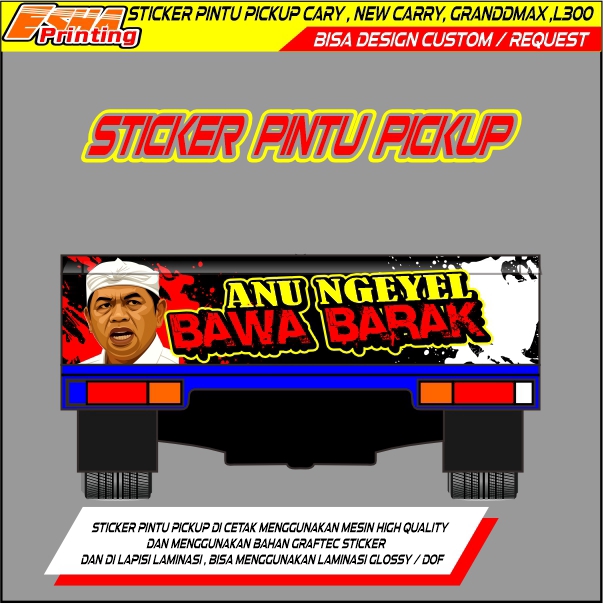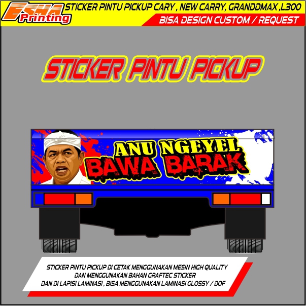 Sticker priting didesain khusus untuk pintu belakang mobil pickup Menggunakan mesin printing indoor sehingga menjadikan gambar hasil print jernih dan tidak pecah Dengan bahan graptack yang tebal lengkap dengan laminasi agar gambar awet dan tahan lama Untuk custom hanya bisa ganti nama saja diluar itu ada tambahan biaya desain Untuk sticker Pintu pickup ini ada beberapa ukuran dan berbeda harganya Sticker Pintu Pickup carry SS Sticker Pintu Pickup New Carry Sticker Pintu Pickup Grand max Sticker Pintu Pickup L300 • Desain Unik: Stiker ini dirancang khusus untuk pintu belakang mobil pickup. Cocok untuk ALL jenis Pickup dengan desain yang bisa Anda request. Tambahkan sentuhan personal ke mobil Anda! • Teknologi Printing: Menggunakan mesin printing indoor. Hasilnya jernih, tidak pecah. Gambar akan tetap tajam dan tahan lama di permukaan stiker. • Kualitas Graptack: Terbuat dari bahan graptack yang tebal. Menjamin ketahanan dan keawetan stiker. Ideal untuk pengguna yang menginginkan stiker berkualitas tinggi. Jadikan pintu belakang mobil Anda lebih menarik dengan stiker ini!