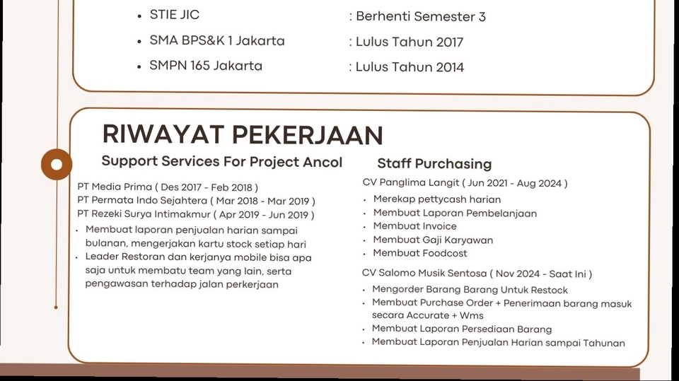 saya bekarja sebagai admin di catering, pekerjaan saya yang biasa saya lakukan mengerjakan rekapan belanja, membuat invoice, meng input data pabrik baru, dan membuat cost,, dan saya juga mengerjakan input stok data gudang menggunakan excel