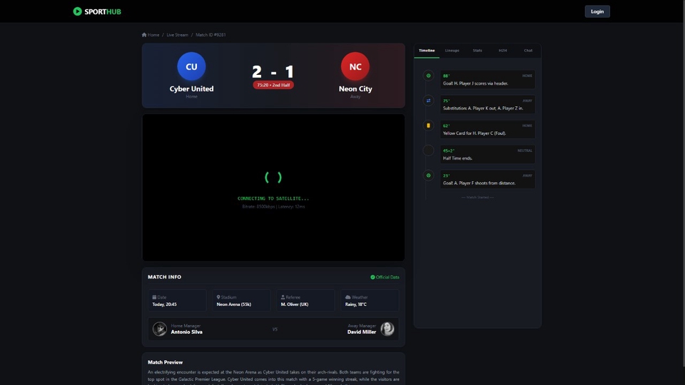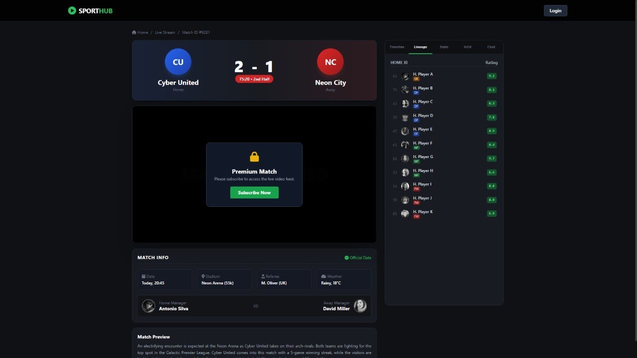 Rp10,0 jt• Full match center • Lineups, statistics, incidents • Advanced filtering & dashboard • Custom backend logic • Advanced API integration• High performance architecture • Ready to scale large traffic