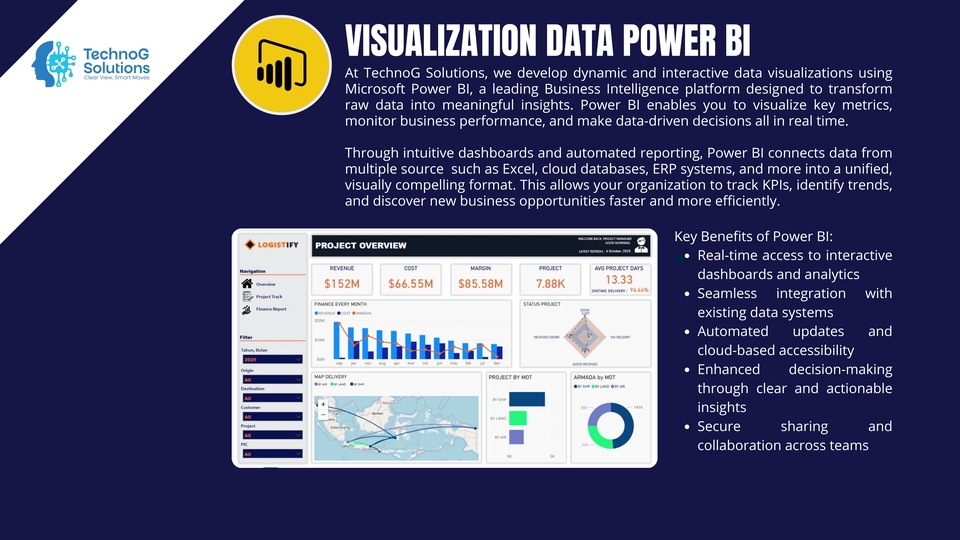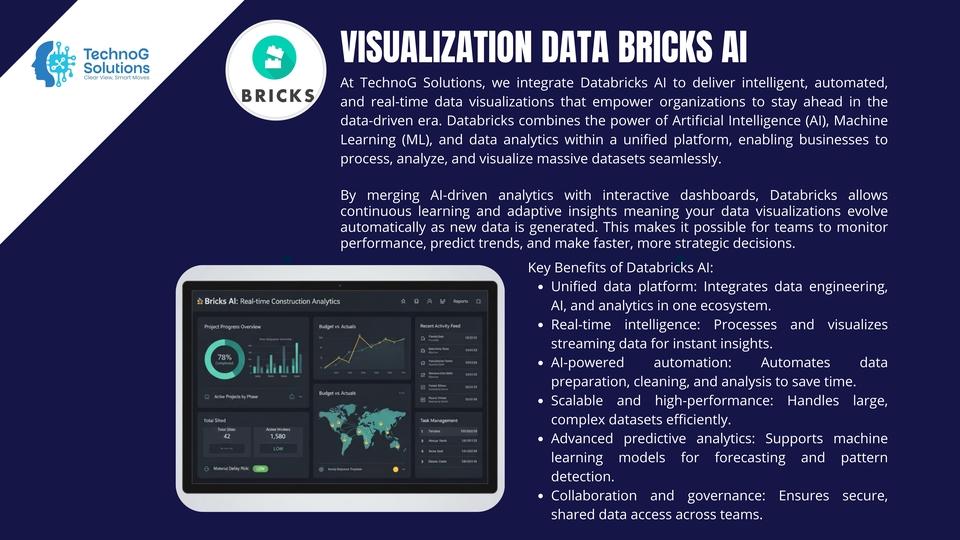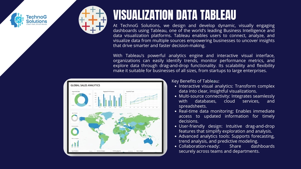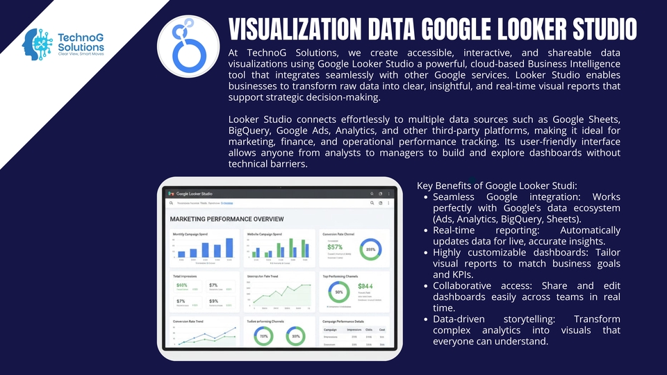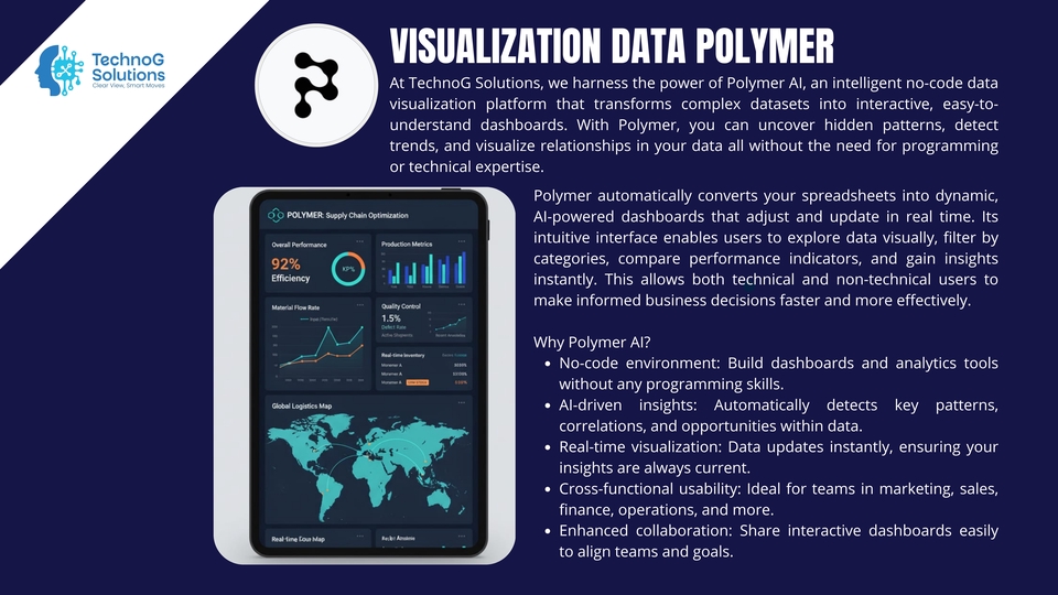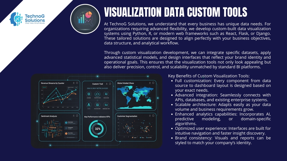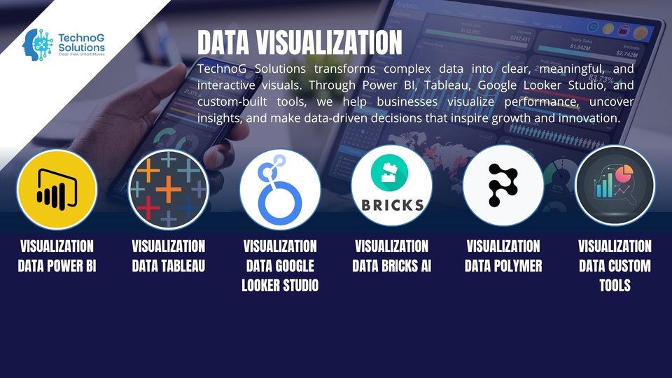 TechnoG Solutions helps you transform raw data into powerful visual stories. We specialize in building dynamic dashboards and interactive reports using leading visualization tools — Power BI, Tableau, Google Looker Studio, Bricks AI, Polymer, and custom-built platforms tailored to your business needs. In today’s data-driven world, understanding your performance metrics is essential. Our visualization experts turn complex datasets into intuitive visuals that highlight key trends, KPIs, and insights, allowing you to make faster and smarter business decisions. We design dashboards that do more than look good — they work for you. Whether you need a management overview, sales performance tracking, marketing analytics, or operations monitoring, every visualization is crafted to deliver clarity, interactivity, and impact. 💡 What We Offer: Interactive dashboards built with Power BI, Tableau, or Google Looker Studio Real-time and automated data updates KPI and performance tracking visuals Data integration from multiple sources (Excel, SQL, APIs, etc.) Custom design and color themes aligned with your brand Insightful analysis and storytelling through visuals Secure sharing and collaboration features 🎯 Why Choose TechnoG Solutions: A strong 2-person core team: a senior developer & a visionary data scientist Blend of technical precision and data storytelling Experience in multiple industries (finance, marketing, logistics, etc.) Focus on both design aesthetics and analytical accuracy End-to-end service: from data cleaning to dashboard delivery Whether you’re a startup, SME, or enterprise, we help you visualize what matters most — your data. From boardroom presentations to operational dashboards, we ensure every visualization tells a meaningful story and empowers you to act with confidence. At TechnoG Solutions, we believe that data is only as valuable as your ability to understand it. Let us turn your data into a visual language that drives decisions, inspires innovation, and scales your business growth.