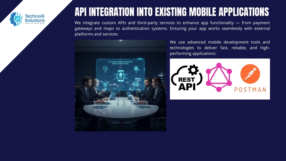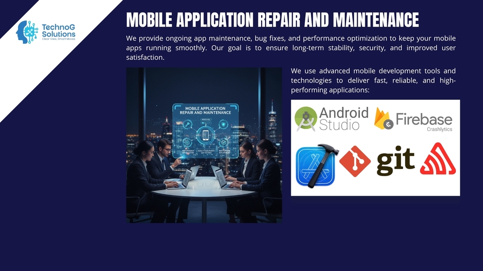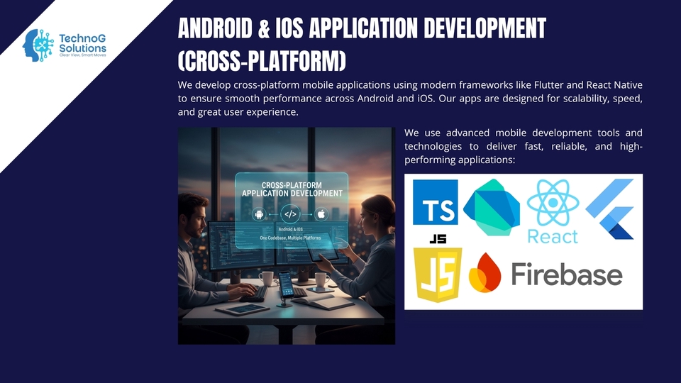 At TechnoG Solutions, we design and build high-performance, scalable, and user-centered mobile applications that empower businesses to connect with their audience anywhere, anytime. Our Mobile Development services focus on creating robust and intuitive apps that combine powerful functionality with seamless user experience — whether for Android, iOS, or cross-platform solutions. From MVP (Minimum Viable Product) development to API integration, app maintenance, and store publication, we help businesses transform ideas into impactful digital products that deliver results. 💡 Our Core Mobile Development Services: 1. Android & iOS Application Development (Cross-Platform) We build powerful cross-platform mobile applications using frameworks like Flutter and React Native — ensuring consistent performance and design across Android and iOS. Each app is crafted for speed, stability, and modern UI/UX, tailored to your business goals. 2. MVP (Minimum Viable Product) Application Development Services For startups or companies validating new ideas, we deliver fully functional MVP apps quickly and efficiently. This approach allows you to test concepts, collect user feedback, and make data-driven improvements before full-scale deployment. 3. API Integration into Existing Mobile Applications We connect your apps with existing APIs, databases, and cloud systems to enhance performance and enable automation. Whether integrating payment gateways, user authentication, or third-party analytics, we ensure secure and seamless connectivity. 4. Mobile Application Repair and Maintenance Our team provides professional app maintenance and debugging services to ensure smooth performance, compatibility, and security. We also help optimize speed, fix crashes, and maintain code quality to keep your application running flawlessly. 5. Publication Services to Google Play Store & Apple App Store We assist in preparing, configuring, and publishing your app to both Google Play and the App Store. Our team ensures compliance with store policies, smooth submission, and optimized app listings for better discoverability and downloads. 🚀 Why Choose TechnoG Solutions: * Expertise in both native and cross-platform development (Flutter, React Native, Kotlin, Swift). * Proven workflow from ideation and prototyping to deployment and post-launch support. * Strong backend integration and API management for scalable, data-driven mobile apps. * Focus on performance optimization, security, and long-term maintainability. * Flexible collaboration — from end-to-end development to dedicated feature enhancements. We don’t just build mobile apps — we engineer digital experiences that enhance your brand, engage users, and drive measurable business growth. With a blend of innovation, precision, and user insight, TechnoG Solutions delivers apps that stand out in both design and performance. 🧠Tools & Technology Stack: Flutter, React Native, Kotlin, Swift, Dart, Node.js, Firebase, REST API, FastAPI, MongoDB, PostgreSQL, SQLite, AWS, Google Cloud, GitHub Actions, and Docker — ensuring each mobile product is scalable, secure, and ready for production.