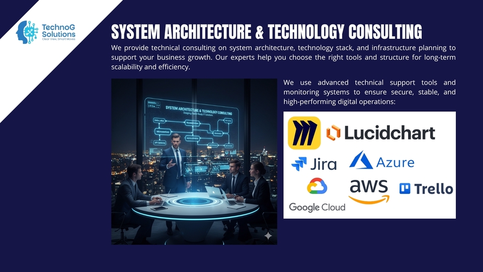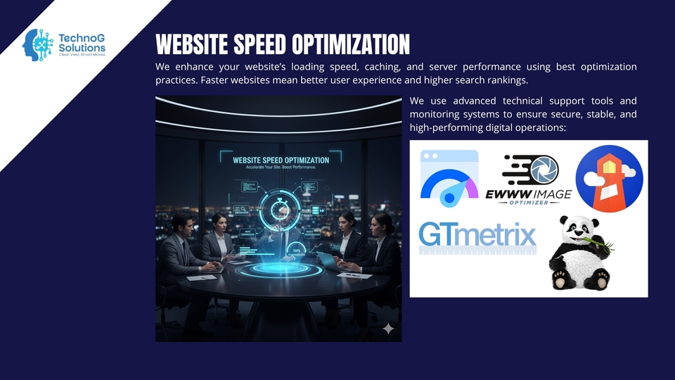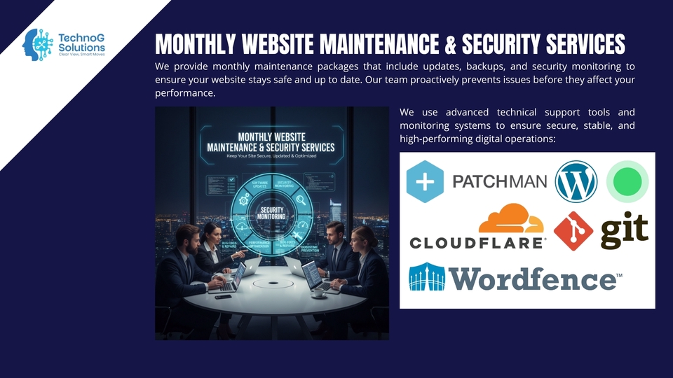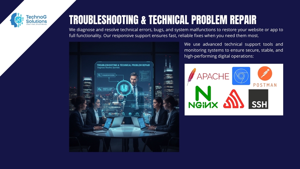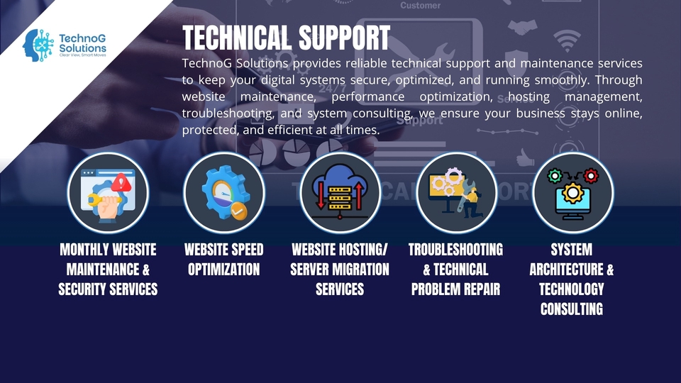 At TechnoG Solutions, we ensure that your digital ecosystem runs smoothly, securely, and efficiently — every single day. Our Technical Support services are designed to maintain the performance, reliability, and protection of your online systems, from websites and servers to integrated digital platforms. We don’t just fix problems; we prevent them. By combining proactive maintenance, optimization, and smart diagnostics, we help your business stay online, minimize downtime, and operate at peak performance. 💡 Our Core Technical Support Services: 1. Monthly Website Maintenance & Security Services Keep your website protected and up to date with monthly maintenance, plugin updates, security patching, and vulnerability checks. We ensure your digital assets remain stable, fast, and compliant with the latest web standards. 2. Website Speed Optimization A slow website means lost opportunities. Our experts analyze performance bottlenecks and implement advanced optimization techniques — improving loading time, responsiveness, and SEO ranking for a seamless user experience. 3. Website Hosting / Server Migration Services Whether you’re upgrading hosting plans or moving to a new provider, we handle smooth and secure migrations. We also offer managed hosting solutions with performance tuning and monitoring, ensuring maximum uptime and reliability. 4. Troubleshooting & Technical Problem Repair We diagnose and resolve critical technical issues — from broken functionalities, bugs, and compatibility errors to server crashes. Our goal is to restore full operation quickly while preventing recurring problems. 5. System Architecture & Technology Consulting We provide expert consulting to enhance your system architecture, ensuring scalability, efficiency, and security. Our team helps you design the right infrastructure to support long-term growth and digital transformation. 🚀 Why Choose TechnoG Solutions: End-to-end support for websites, databases, and cloud infrastructures. Fast response times and transparent issue tracking. Preventive maintenance that saves costs before problems appear. Experienced developers and system engineers ensuring optimal uptime. Scalable solutions tailored for startups, enterprises, and growing businesses. At TechnoG Solutions, we take care of the technology, so you can focus on your business. Our mission is to ensure that your systems stay online, optimized, and future-ready — giving you the confidence that your digital backbone is always in expert hands.