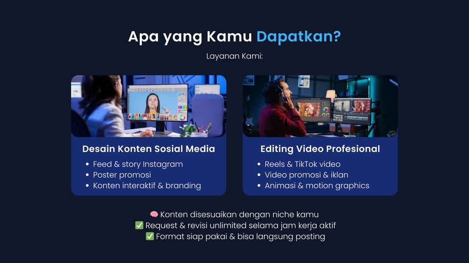 Rp2,6 jtUntuk kamu yang butuh bantuan konten harian. ✔️ 1 bulan, 5 hari kerja per minggu ✔️ 3 jam kerja per hari ✔️ Desain & video editing unlimited