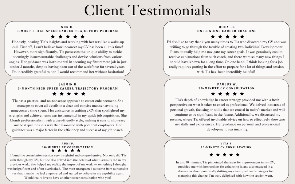 Saya membantu pencari kerja mendapatkan pekerjaan impian mereka dengan pendekatan yang disesuaikan dengan kebutuhan masing-masing individu. Dengan pengalaman lebih dari 11 tahun di bidang Rekrutmen dan HR, saya telah membantu pencari kerja dari berbagai negara dalam menyusun resume yang menarik, mengoptimalkan profil LinkedIn, mempersiapkan wawancara, hingga menyusun strategi pencarian kerja dan negosiasi gaji. Saya percaya bahwa setiap orang memiliki perjalanan karier yang unik, jadi saya tidak menawarkan solusi satu ukuran untuk semua—saya menyesuaikan strategi berdasarkan latar belakang, tujuan, dan tantangan Anda. Tujuan saya adalah memastikan Anda memiliki kepercayaan diri, strategi yang tepat, dan persiapan maksimal untuk mendapatkan pekerjaan yang Anda inginkan. Langkah Pekerjaan 1. Client memilih paket yang diinginkan 2. Client melakukan pembayaran 3. Freelancer mengirimkan survey singkat untuk mendapatkan informasi lebih lanjut: CV, posisi yang ingin dilamar, dsb 4. Freelancer melakukan pekerjaan 5. Freelancer mengirimkan hasil