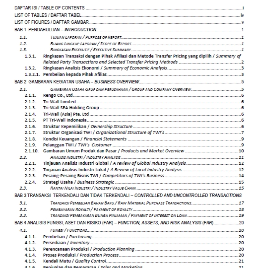 Transfer Pricing Documentation Benchmarking Database (Oriana, TP Catalyst) OECD & PMK 172/2023 Guidelines Analisis Keuangan Microsoft Excel (Advanced) Analitis & teliti Komunikasi dan presentasi Manajemen proyek Mendampingi klien saat pemeriksaan pajak dan keberatan atas isu TP. Langkah Pekerjaan 1. Wawancara dengan Klien 2. Penyerahan dokumen yang diperlukan 3. Wawancara lanjutan (jika diperlukan) 4. Proses penyusunan 5. Review Dokumen 6. Finalisasi