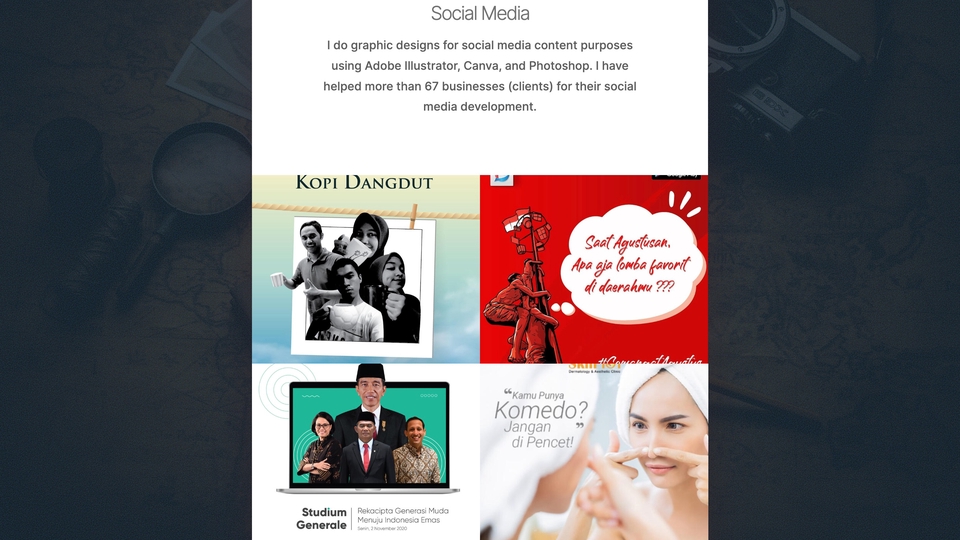 Berpengalaman di bidang digital marketing selama lebih dari 3 tahun, termasuk pembuatan konten, penulisan konten, desain grafis, iklan, dan engagement. Sudah membantu lebih dari 120 klien di Indonesia dan Inggris. Langkah Pekerjaan 1. Memulai offering 2. Melakukan negosiasi dan brief kerja 3. Dealing melalui contact person 4. Meeting pengerjaan, deadline, revisi, dan media yang digunakan 5. Evaluasi hasil kerja