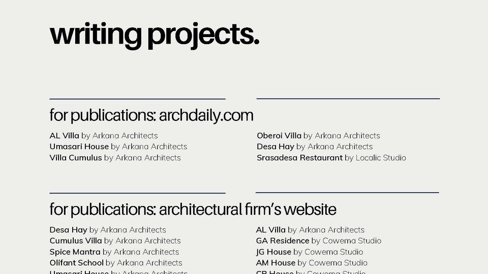 Jasa Penulisan Artikel Desain dan Arsitektur Profesional Butuh artikel yang menginspirasi dan informatif untuk audiens arsitek, desainer, atau pecinta desain? Saya menawarkan jasa penulisan artikel berkualitas tinggi dengan fokus pada desain dan arsitektur. Keunggulan jasa saya: ✔ Research-based Writing: Artikel yang kaya informasi dan data, sesuai tren terkini. ✔ Tone yang Tepat: Disesuaikan dengan audiens, mulai dari profesional hingga mahasiswa. ✔ Fokus pada Detail: Mengupas desain dari konsep hingga eksekusi, lengkap dengan analisis mendalam. ✔ Pengalaman Luas: Berpengalaman menulis untuk media arsitektur terkemuka dan platform desain. Apakah Anda memerlukan artikel untuk publikasi, media sosial, atau website? Saya siap membantu menghasilkan tulisan yang menarik, mengalir, dan relevan. Pesan sekarang, dan buat konten Anda stand out di dunia desain dan arsitektur! Langkah Pekerjaan 1. menerima brief dari pemberi tugas 2. melakukan riset 3. proses menulis artikel 4. mengirimkan tulisan kepada pemberi tugas 5. melakukan revisi (jika diperlukan) 6. mengirimkan tulisan hasil revisi kepada pemberi tugas