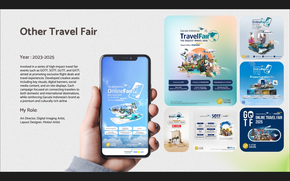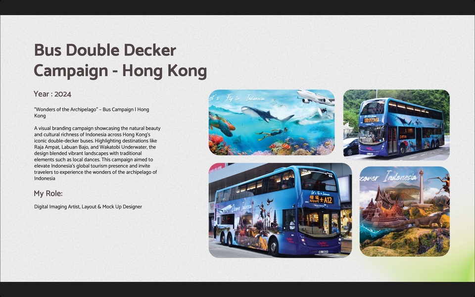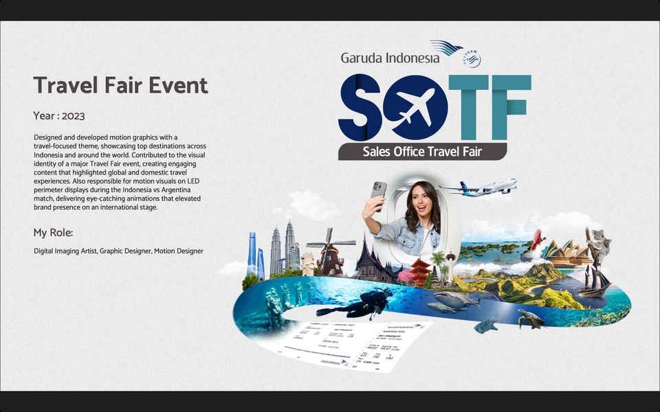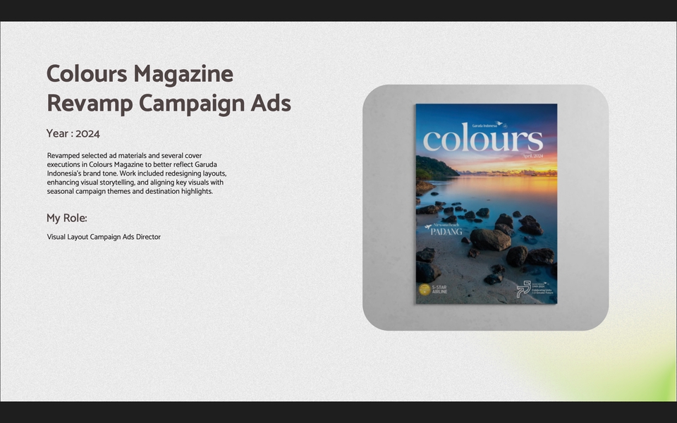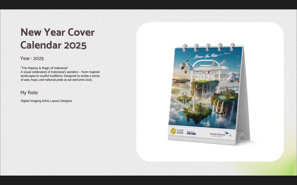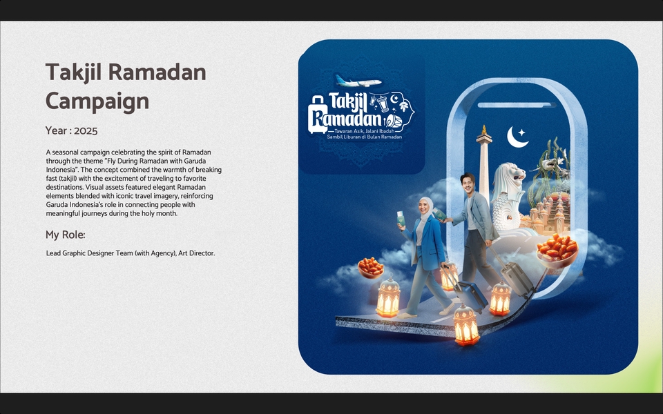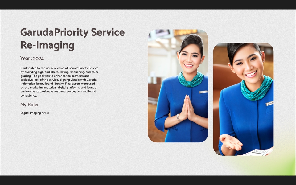 Halo! Saya Ulwan Sulhi Zayyan Senior Graphic Designer & Art Director (4+ Tahun Pengalaman). Apakah Anda membutuhkan visual iklan yang tidak hanya estetik, tetapi juga memiliki konsep kuat, detail tajam, dan standar korporat? Saya berpengalaman menangani Key Visual (KV) untuk brand nasional sekelas Garuda Indonesia. Layanan ini dikhususkan bagi Anda yang mengutamakan kualitas High-End Digital Imaging. Apa yang saya tawarkan? Saya membangun Visual Komersial baru dari nol melalui teknik manipulasi foto tingkat lanjut: ✅ Digital Imaging (DI) Premium: Menggabungkan berbagai elemen foto menjadi satu komposisi yang realistis, imersif, dan cinematic (seperti contoh portofolio). ✅ Key Visual (KV) Campaign: Desain utama untuk kampanye pemasaran, peluncuran produk, atau materi event yang siap diturunkan ke berbagai media. ✅ High-End Retouching: Perbaikan detail produk/model untuk standar majalah atau iklan luar ruang (OOH). ✅ Art Direction: Konsultasi konsep visual agar selaras dengan brand identity bisnis Anda. Mengapa memilih saya? Proven Track Record: Berpengalaman memimpin proyek visual untuk industri penerbangan dan travel skala besar. Attention to Detail: Ketelitian tinggi pada pencahayaan (lighting), perspektif, dan color grading. Strategic Design: Desain yang dibuat untuk meningkatkan penjualan dan brand image. ⚠️ PENTING (DISCLAIMER PORTOFOLIO): Gambar-gambar yang ditampilkan di galeri (terkait Garuda Indonesia/Partner) adalah sampel portofolio profesional saya selama menjabat sebagai Art Director/Lead Designer. Hak Cipta sepenuhnya milik klien terkait. Gambar tersebut ditampilkan semata-mata sebagai bukti kapabilitas teknis dan skala proyek yang mampu saya kerjakan.
