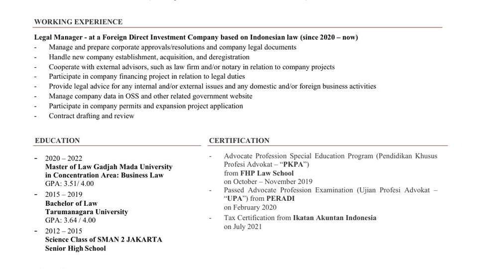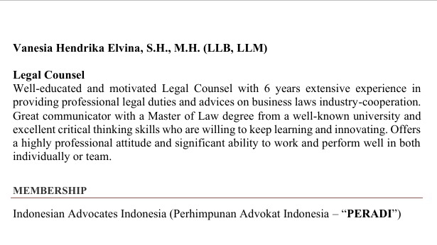 - Bachelor of Law, Tarumanagara University - Master of Business Law, Gadjah Mada University - Member of PERADI (Indonesian Advocate Association) - Legal counsel at a foreign direct investment group company based in Indonesia with more than 5 years experience.