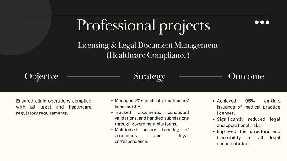 I am a Legal Administrative Specialist experienced in handling licensing, regulatory compliance, and structured document management. I help businesses stay legally compliant with smooth, accurate, and efficient processes. Services I Offer: - Business licensing & renewal management - Legal document administration & filing - Document validation and submission to government platforms - Contract organization and document structuring - Compliance monitoring & deadline tracking - Regulatory administration for healthcare, retail, and general businesses Why Work With Me: - Experienced in managing 20+ licensing documents simultaneously - Highly detail-oriented, organized, and reliable - Strong understanding of government workflows & platforms - Fast response, transparent communication, and on-time delivery - Minimizes legal risks and ensures smooth operational compliance Your reliable partner for fast, accurate, and compliant legal administration.