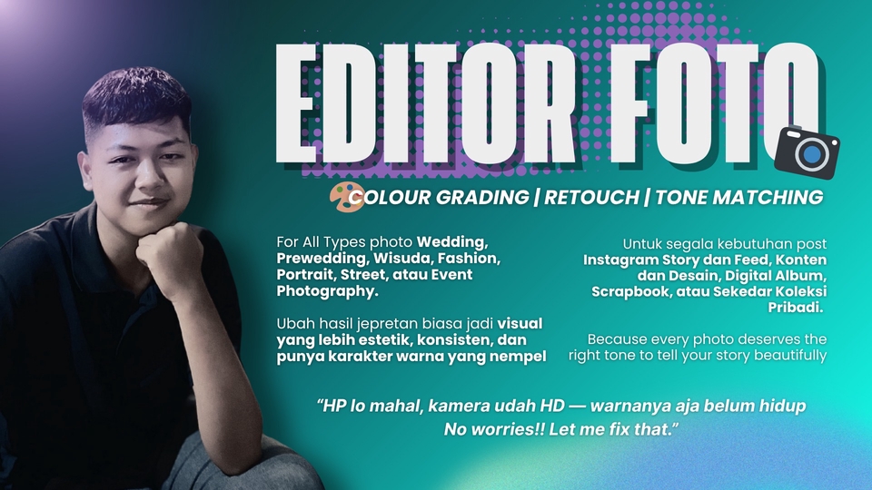 Ingin hasil fotomu tampil lebih estetik, konsisten, dan punya karakter warna yang kuat? Saya siap bantu kamu ubah hasil jepretan biasa jadi visual yang hidup dan profesional. ✨ Layanan yang saya tawarkan: • 🎨 Colour Grading: Penyesuaian tone dan warna agar tampilan foto lebih sinematik & berkarakter. • 🧴 Retouch: Perbaikan detail wajah, pencahayaan, dan tekstur agar tampak natural tapi menawan. • ⚖️ Tone Matching: Menyamakan tone antar foto untuk feed Instagram, katalog, atau album digital. --- 📸 Cocok untuk: • Wedding / Prewedding • Wisuda & Portrait • Fashion / Street Photography • Konten Instagram, Scrapbook, Digital Album, hingga Desain Komersial 💬 “HP lo mahal, kamera udah HD — tapi warnanya belum hidup? No worries! Let me fix that.” --- 🎯 Kenapa pilih saya? • Hasil visual lebih estetik & berkualitas • Tone warna konsisten dan menyesuaikan setiap kebutuhan konten • Revisi fleksibel sampai sesuai keinginan • Cocok buat kebutuhan personal maupun komersial --- Catatan Tambahan: - Tambahan foto: Rp10.000–15.000/foto - Bisa request tone/style khusus (kirim referensi) - Pengerjaan ekspres +50% dari harga paket --- Saya percaya setiap foto memiliki cerita serta emosi yang bisa dihidupkan lewat tone warna yang tepat. Mari wujudkan karya Anda menjadi lebih hidup, berkesan, dan profesional mulai dari ide, konsep, hingga hasil akhir yang memuaskan. 💬 Silakan kirim pesan untuk berdiskusi dan mulai proyek Anda sekarang!