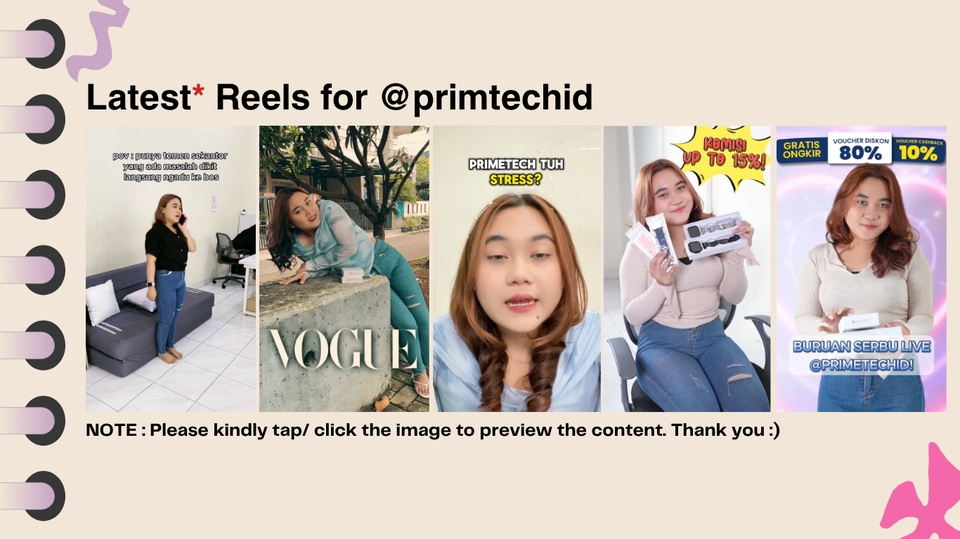 Rp4,0 jtPrice for : - 1 social media account / personal - 5 Content feeds & 5 reels per MONTH - FREE 1 Instagram Story per week - Expert with more than 3 years experience in Creative Social Media Industry