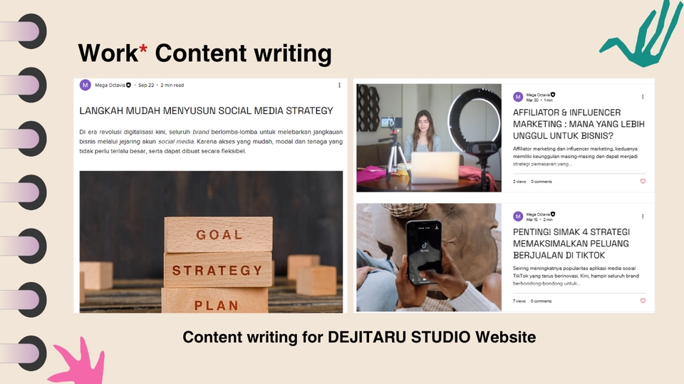 Hi, I'm Via! I’m a Digital & Social Media Specialist with almost 4 years of experience in the content industry. I create, plan, and schedule digital content that’s not just informative—but also fun, interactive, and tailored to your brand. I’ve worked with clients from various industries, writing copy for social media, ads, and websites. I also help produce engaging content like Reels, TikToks, and YouTube Shorts—from concept to final edit. Here’s how I work: - Discuss your needs - Start design or editing process - Share preview for your feedback - Final upload when you're happy with the result Let’s create content that clicks with your audience!