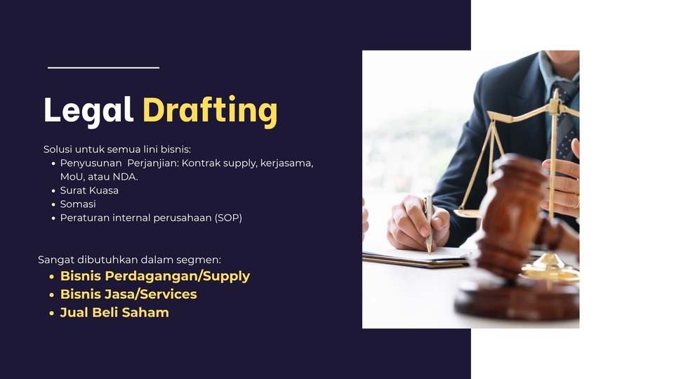 Profesional hukum dengan pengalaman pelayanan hukumlegal review, legal opinion, penyusunan kontrak, pendampingan litigasi/konsultasi, dan compliance untuk mengurangi risiko kukum. Respon cepat terhadap kebutuhan dan pertanyaan. Berorientasi pada solusi legal issue individu atau badan hukum. Akuntabel & Biaya terjangkau.