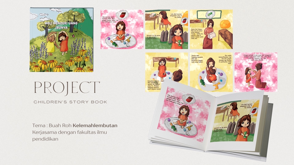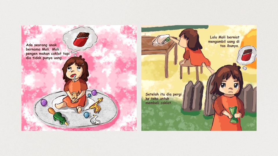 Hallo. Saya Kezia Holly mahasiswa jurusan DKV yang part-time. Saya seorang ilustrator membuat ilustrasi buku anak dengan ilustrasi yang lucu dan menyenangkan. Ilustrasi yang dibuat sesuai dengan naskah yang telah disiapkaan oleh klien. Langkah PekerjaanUntuk ILUSTRASI BUKU ANAK / CHILDREN'S BOOK ILLUSTRATION 1. Membuat sketsa kasar sesuai dengan naskah yang telah disiapkan 2. Revisi sketsa bila ada tambahan dari klien 3. Pewarnaan dasar ilustrasi 4. Pewarnaan detail ilustrasi, bila ada tambahan untuk layout klien bisa meminta Langkah Pekerjaan 1. Sketsa kasar dengan naskah dari klien 2. Revisi sketsa apabila ada tambahan dari klien 3. Pewarnaan dasar illustrasi 4. Pewarnaan detail Ilustrasi