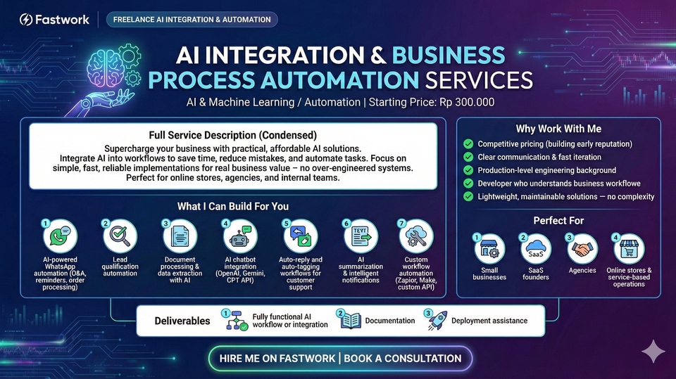 Supercharge your business with practical, affordable AI solutions. I help businesses integrate AI into their existing workflows to save time, reduce operational mistakes, and automate repetitive tasks. My focus is simple, fast, and reliable AI implementations that deliver real business value — not over-engineered systems. Whether you're an online store, service business, agency, or internal team, I build automation that actually works in the real world. What I Can Build For You AI-powered WhatsApp automation (Q&A, reminders, order processing) Lead qualification automation Document processing & data extraction with AI AI chatbot integration (OpenAI, Gemini, GPT API, etc.) Auto-reply and auto-tagging workflows for customer support AI summarization & intelligent notifications Custom workflow automation (Zapier, Make, custom API) Why Work With Me Competitive pricing (I’m building early reputation) Clear communication & fast iteration Production-level engineering background Developer who actually understands business workflows Lightweight, maintainable solutions — no unnecessary complexity Perfect For Small businesses, SaaS founders, agencies, online stores, and service-based operations that want AI without spending millions. Deliverables Fully functional AI workflow or integration Documentation Deployment assistance Optional ongoing support