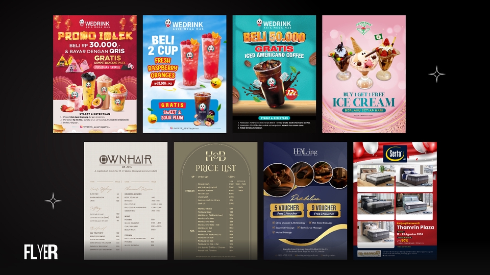 Rp100,0 rb1. Daftar desain mencakup; - Spanduk - Roll / X Banner - Baliho - Umbul-umbul - Backdrop - Tenda Becak - Menu / Price List - Brosur - Flyer (A5/A4) - Poster (A4/A3/A2) 2. File final JPEG/PDF (Siap cetak atau CMYK) 3. Revisi 3x 5. Durasi pengerjaan hanya estimasi Nb. Harga bisa naik tergantung tingkat kesulitan. Tambahan 25K untuk File Mentah (PSD/AI)