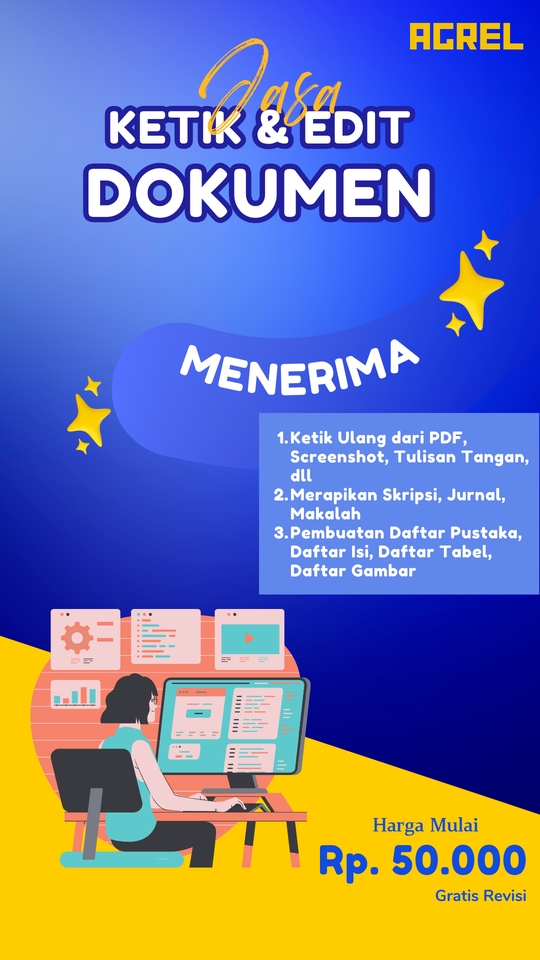 Rp50,0 rbKetik dan Edit / Pembuatan Daftar Pustaka / Daftar Isi / Daftar Tabel /Daftar Gambar (*Pilih Salah Satu) Jumlah halaman 1-50 : Rp. 300.000 Jumlah halaman 51-100 : Rp. 350.000 Jumlah halaman 101-200 : Rp. 500.000 Jumlah halaman 201-500 : Rp. 1.000.000 Jumlah halaman >500 : Rp. 300.000