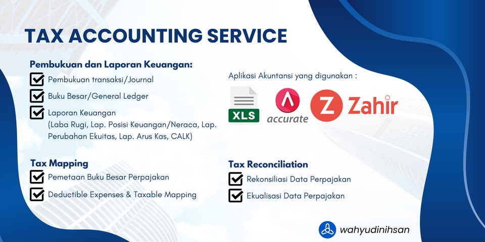 Rp1,5 jtPembukuan dan Laporan Keuangan 1. Pembukuan Transaksi menggunakan aplikasi akuntansi 2. Pembuatan Laporan Keuangan (Lap. Laba Rugi, Neraca, Lap. Ekuitas, Arus Kas, CALK) Pemetaan Perpajakan 1. Pemetaan Buku Besar Perpajakan untuk Deductible dan Non Deductible Expenses Rekonsiliasi Perpajakan 1. Rekonsiliasi Fiskal 2. Ekualisasi PPh dan Biaya, PPN dan Penghasilan