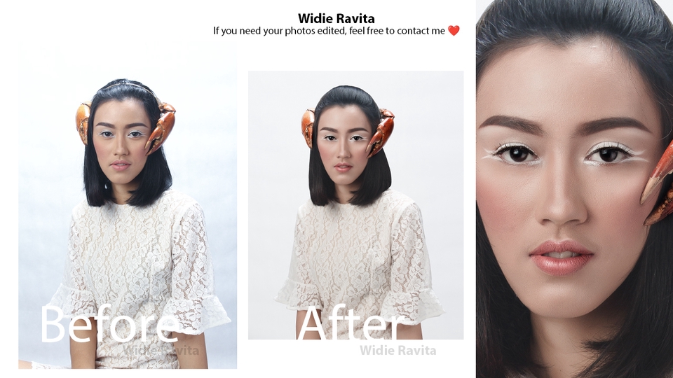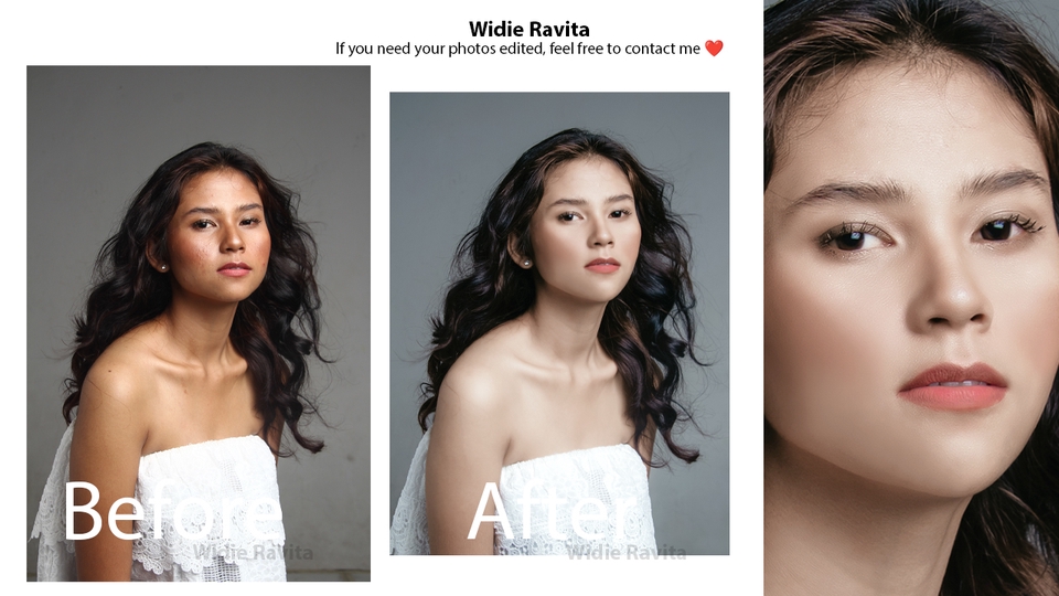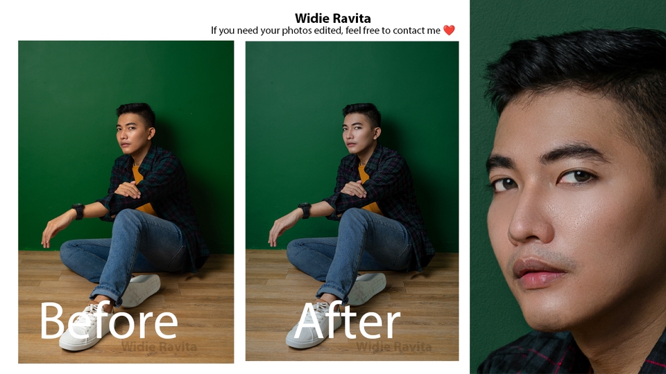 Halo, salam kenal Nama saya Widie Ravita, saya seorang Photographer, Editor Photo & Graphic designer dan berpengalaman lebih dari 10 tahun. Pengerjaan yang bisa saya lakukan: • Edit Foto di photoshop/lightroom • Hapus / ganti background / remove background • Hapus Objek di foto • Mengganti warna objek • Membersihkan jerawat, noda, goresan dan hal lainnya yang non-permanen • Memperhalus kulit • Manipulasi gambar • Media promosi (banner, flyer, kartu nama, web banner, banner online, banner marketplace, banner shopee) • Brosur, brosur, keperluan print atau cetak, Flyer • Desain feeds IG, web banner, Digital Printing • Kemasan, Packaging, Label, Kartu Nama, Spanduk, Katalog, Kalender, Company Profile, Layout Buku, Cover Buku, Poster Langkah Pekerjaan untuk Image Editing Profesional 1. klien mengirimkan file photo yang akan di edit 2. Diskusi mengenai poin poin yang akan dikerjakan 3. Tahap Pengerjaan 4. Pengiriman draf pekerjaan 5. Tahap revisi jika ada, revisi tidak jauh dari konsep awal 6. Tahap pengiriman hasil kerja setelah hasil di setujui Langkah Pekerjaan 1. Diskusi tentang photo sesuai keinginan client (Via Chat) 2. Client mengirimkan file foto yang akan di edit 3. proses pengerjaan 4. Pengiriman draft 5. Revisi jika ada 6. pengiriman hasil akhir