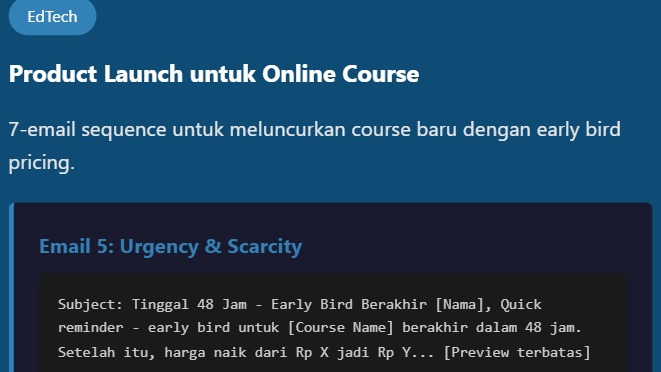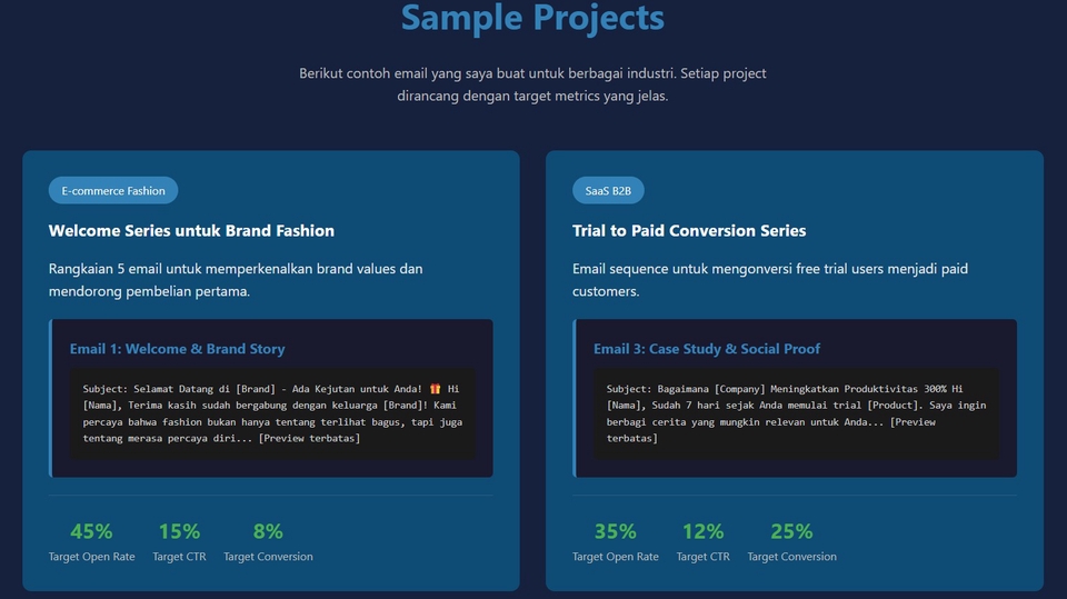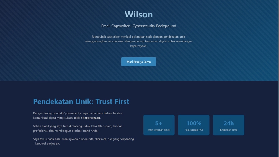 Apakah daftar email Anda terasa seperti aset yang tidak berguna? Anda sudah susah payah mengumpulkan subscriber, tapi setiap kali mengirim email, yang Anda dengar hanyalah... sunyi. Tidak ada yang membalas, tidak ada yang mengklik, dan yang paling penting, tidak ada penjualan yang masuk. Jika ini terdengar seperti masalah Anda, Anda berada di tempat yang tepat. Saya Wilson, seorang Email Copywriter Profesional yang tidak hanya merangkai kata. Saya membangun jembatan kepercayaan antara brand Anda dan pelanggan Anda melalui email yang benar-benar dibaca dan direspons. Mengapa Email dari Saya Berbeda? Pendekatan Cybersecurity. Dengan latar belakang unik di bidang Cybersecurity, saya memahami fondasi terpenting dari semua komunikasi digital: Kepercayaan (Trust). Email yang saya tulis tidak hanya persuasif, tetapi juga dirancang untuk: Lolos dari Filter Spam: Menggunakan praktik terbaik agar pesan Anda sampai ke inbox utama. Terlihat Profesional: Menghindari bahasa "jualan murahan" yang membuat pelanggan lari. Membangun Otoritas: Setiap kata bertujuan untuk membangun citra brand Anda sebagai ahli yang bisa dipercaya. Layanan yang Saya Tawarkan untuk Mengubah Subscriber Jadi Pelanggan Setia: ✅ Seri Email Selamat Datang (Welcome Email Series) Mengubah pengunjung asing menjadi teman yang percaya pada brand Anda. Ini adalah kesempatan terbaik untuk membuat kesan pertama yang tak terlupakan dan mendorong pembelian pertama. ✅ Email Penjualan & Promosi Merancang email yang fokus pada satu tujuan: menghasilkan pendapatan. Baik itu untuk diskon, penawaran khusus, atau pengumuman produk. ✅ Buletin / Newsletter Berkala Menjaga hubungan baik dengan pelanggan Anda melalui konten berharga yang mereka tunggu-tunggu, bukan yang mereka arsipkan. ✅ Email Pemulihan Keranjang (Abandoned Cart Recovery) Menyelamatkan penjualan yang nyaris hilang dengan email pengingat yang ramah, persuasif, dan mendesak. ✅ Rangkaian Email Peluncuran Produk (Product Launch Sequence) Menciptakan antisipasi, hype, dan permintaan yang tinggi sebelum produk Anda resmi dirilis, memastikan peluncuran yang sukses. Bagaimana Proses Kerja Kita? Diskusi & Briefing: Anda ceritakan tentang bisnis, target audiens, dan tujuan Anda. Riset & Strategi: Saya mendalami "suara" brand Anda dan apa yang diinginkan oleh audiens Anda. Penulisan Draf Pertama: Saya akan menyusun draf email yang persuasif sesuai strategi. Revisi & Finalisasi: Kita akan bekerja sama untuk menyempurnakan draf hingga Anda 100% puas. Anda tidak hanya menyewa seorang penulis. Anda berinvestasi pada seorang mitra strategis yang menggabungkan seni persuasi, psikologi konsumen, dan presisi teknis. Siap mengubah daftar email Anda menjadi mesin penjualan yang loyal? Klik tombol "Pesan Sekarang" atau kirim saya pesan untuk mendiskusikan kebutuhan Anda. Mari kita mulai!