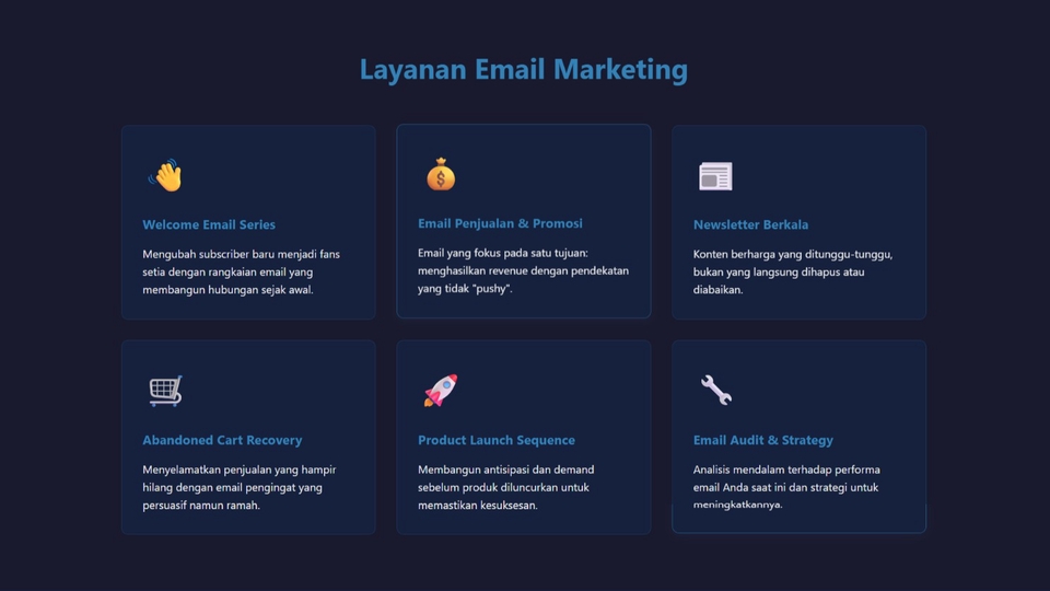 Rp125,0 rbCocok untuk Anda yang butuh satu email promosi cepat atau ingin mencoba layanan saya. Saya akan tulis satu email persuasif yang fokus pada satu tujuan spesifik untuk brand Anda