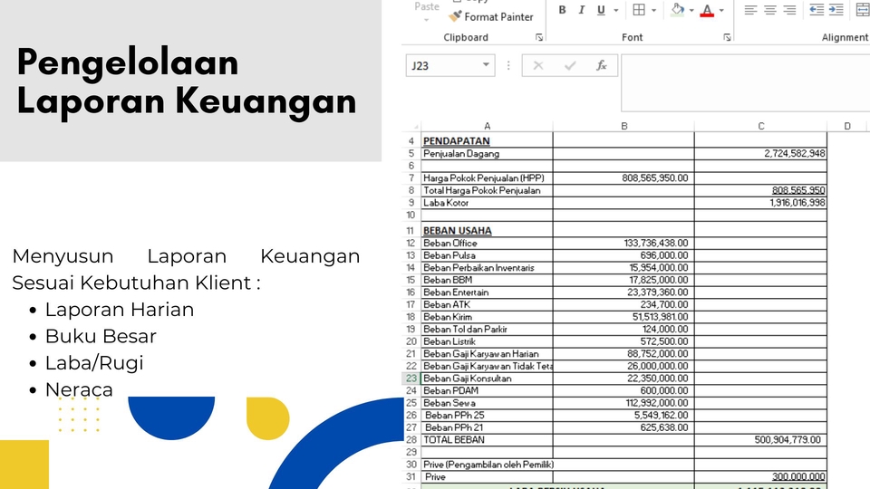 Jasa Finance dan Akuntansi Mengelola keuangan bisnis dengan efisien sangat penting untuk kelangsungan usaha Anda. Dengan pengalaman lebih dari 7 tahun di bidang keuangan dan administrasi, saya siap membantu Anda mengatur keuangan dan pembukuan secara akurat dan transparan. Layanan yang saya tawarkan: ✔️ Penyusunan laporan keuangan (balance sheet, profit & loss) ✔️ Jasa pembukuan harian, mingguan, bulanan ✔️ Rekonsiliasi bank dan pencocokan transaksi ✔️ Manajemen arus kas (cash flow management) ✔️ Penyusunan laporan pajak bulanan dan tahunan ✔️ Konsultasi dan audit sederhana terkait keuangan usaha Kami mengutamakan ketelitian, kerahasiaan, dan penggunaan sistem akuntansi modern untuk memastikan setiap transaksi dan laporan terekam dengan baik. Kenapa memilih kami? ✓ Tim berpengalaman di bidang keuangan dan akuntansi ✓ Berbasis teknologi terkini untuk memudahkan integrasi data ✓ Harga kompetitif dengan hasil yang memuaskan Konsultasikan kebutuhan keuangan Anda bersama kami sekarang, dan biarkan kami membantu Anda menciptakan keuangan bisnis yang lebih teratur dan efisien! Langkah Pekerjaan 1. Memberikan Detail Pekerjaan 2. Diskusi Pengerjaan dan hasil 3. Pembayaran 4. Pengerjaan Tugas 5. Pengiriman Hasil Kerja 6. Memberikan Review Setelah Pekerjaan Selesai