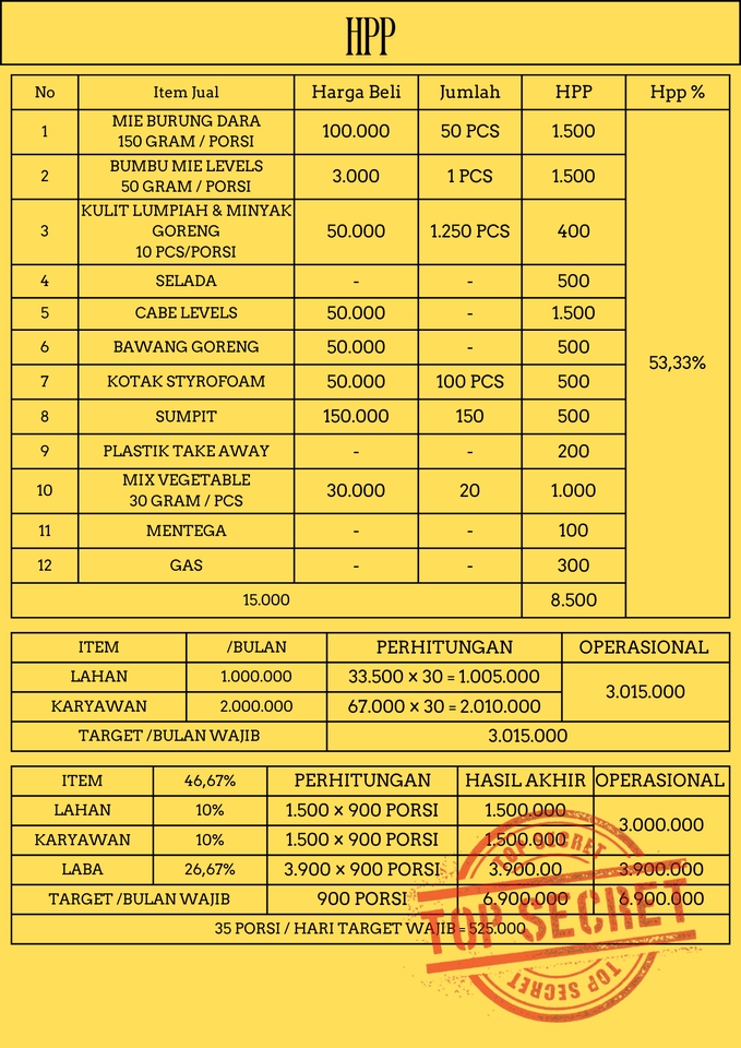 Dokumen untuk untuk memulai bisnis, dari awal sampai pembukaan bisnis semua sesudah tersedia. Mulai dari HPP produk, persentase, perhitungan return of capital, visual bisnis berjalan, form pembukuan, recipe produk, dan data data yang lengkap. Mulai bisnis anda dengan referensi dari dokumen yang saya buat.