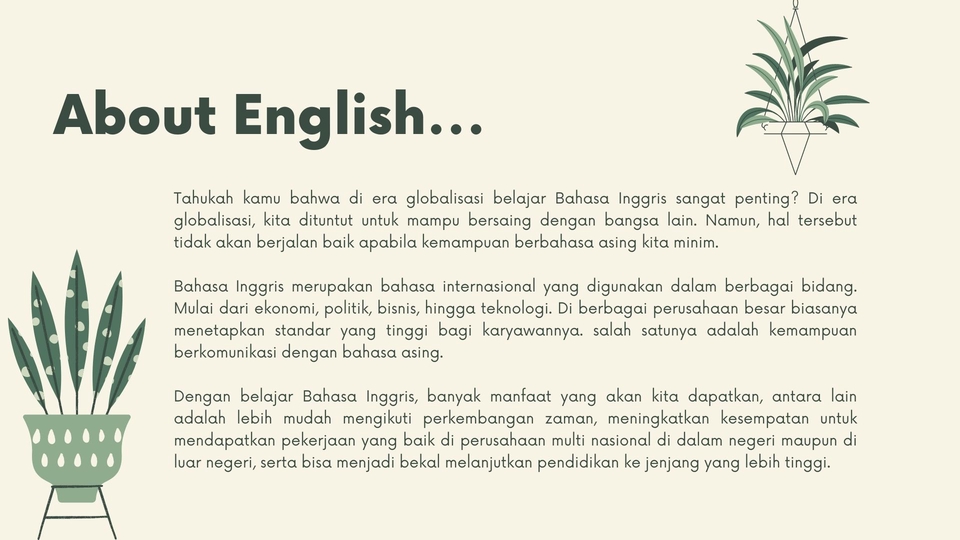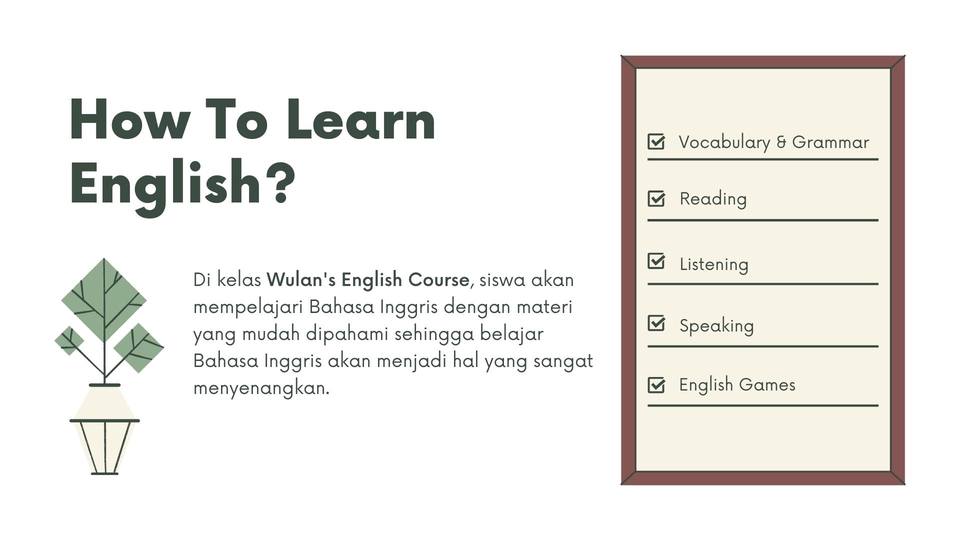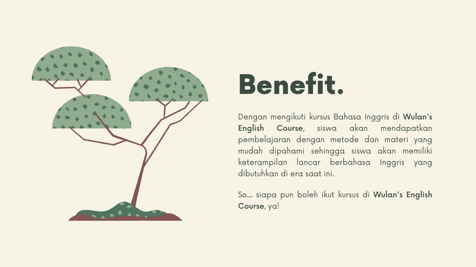 Tahukah kamu bahwa di era globalisasi belajar Bahasa Inggris sangat penting? Bahasa Inggris merupakan bahasa internasional yang digunakan dalam berbagai bidang. Mulai dari ekonomi, politik, bisnis, hingga teknologi. Dengan belajar Bahasa Inggris, banyak manfaat yang akan kita dapatkan. Kenapa ikut kelas Wulan's English Course? - Jadwal kursus yang fleksibel sesuai kebutuhan siswa - Harga terjangkau, jauh lebih murah dari kursus konvensional - Bisa tunggal atau berkelompok. - Metode dan materi pengajaran yang menyenangkan dan luwes. Siswa dapat memilih materi yang ingin dipelajari atau hanya berdiskusi tentang tugas dari sekolah. Namun jika tidak ada permintaan khusus dari siswa, saya akan mengajarkan materi sesuai kurikulum. - Maksimal 2x pertemuan per minggu dengan durasi belajar 60 menit per pertemuan. Silahkan hubungi saya untuk diskusi permintaan kursus dengan durasi yang lebih lama dan materi yang lebih banyak (persiapan ujian, wawancara, dll) Langkah Pekerjaan 1. Mendiskusikan jadwal kursus. 2. Mendiskusikan metode dan materi pengajaran yang dibutuhkan siswa. 3. Melakukan pembayaran via Fastwork untuk paket yang telah dipilih.