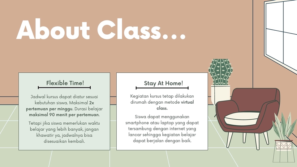 Rp200,0 rb- Harga yang tertera adalah harga untuk 1x pertemuan per 5 siswa - Minimal jumlah siswa adalah 5 orang per pertemuan - Durasi belajar maksimal 60 menit