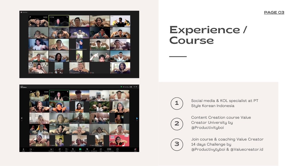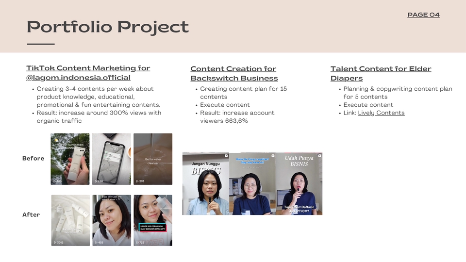 Saya merupakan content creator specialist yang sudah memiliki pengalaman bekerjasama dengan berbagai brand dibidang kecantikan, lifestyle, education dan beberapa industri lainnya. Saya juga mengambil course khusus mengembangkan konten serta memiliki skill dibidang digital marketing lainnya seperti SEO & content planning, content writting, content production & social media management juga