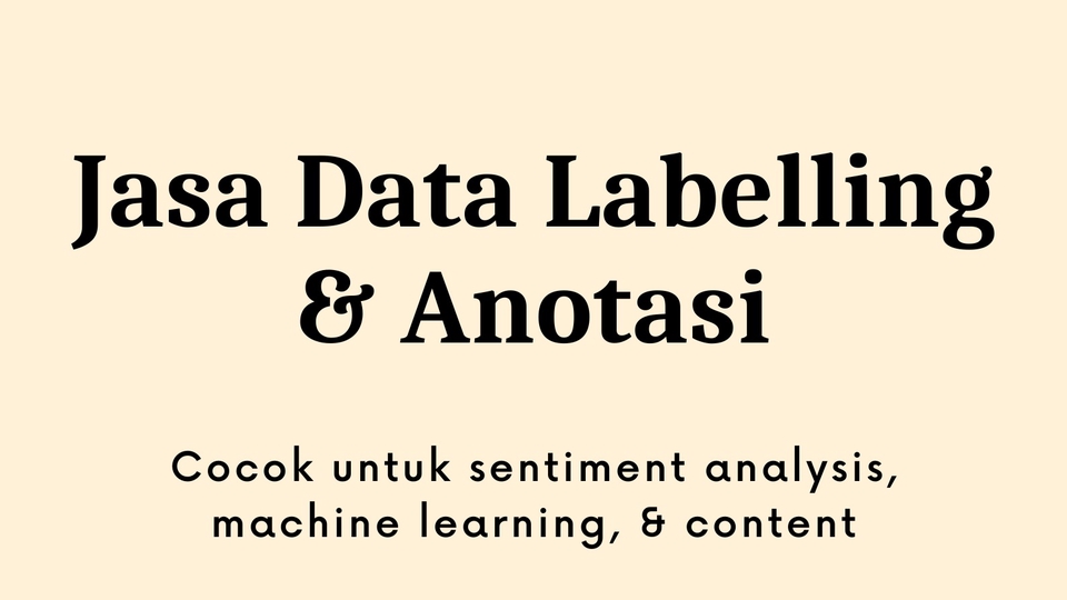 Pengalaman data label dan anotasi selama 7++ tahun 1. Pelabelan sentimen (positif, negatif netral) 2. Kategori produk (elektronik, handphone, pakaian, dan sebagainya) untuk ecommerce 3. Kategori konten (gambar, video) 4. Pelabelan kuantitatif dan kualitatif (low, medium, high) 5. Pelabelan kualitas konten (low, medium, high) 6. Pelabelan hasil SEO, search engine, dan boolean ML result (True, False) MB: Biaya dan requirement sesuai kesepakatan