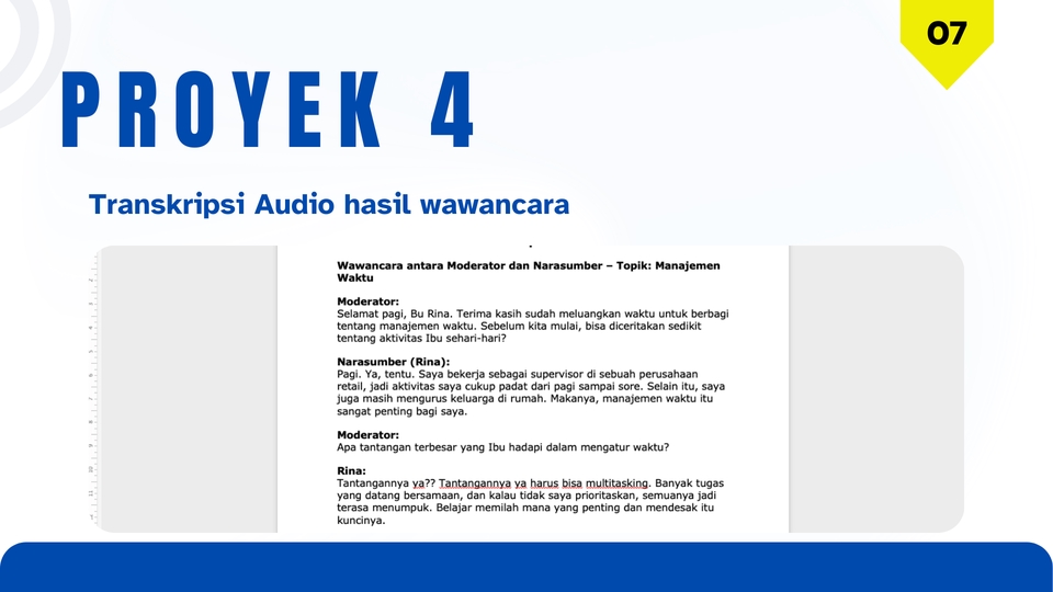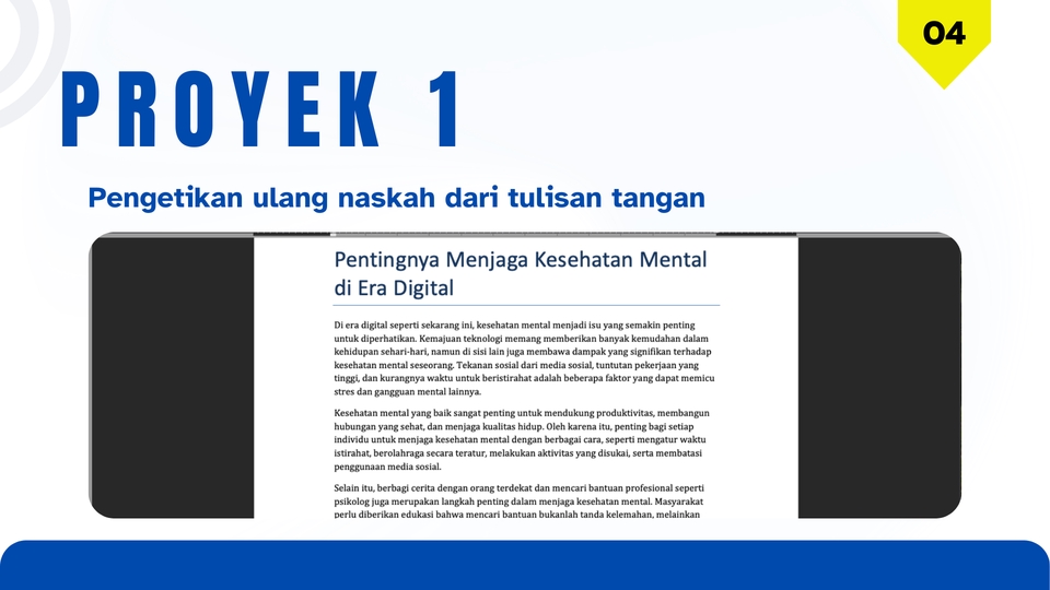 Anda butuh jasa pengetikan cepat, rapi dan terpercaya?? Saya siap membantu Anda menyelesaikan berbagai kebutuhan pengetikan dengan hasil yang profesional dan tepat waktu. Keamanan dan kerahasiaan dokumen Anda adalah prioritas saya. Layanan yang saya tawarkan : 1. Pengetikan ulang dokumen PDF, foto, JPG, Screenshot, tulisan tangan, dll 2. Mengetik naskah, artikel, laporan, tugas sekolah/kuliah 3. Convert file ke word/Excel 4. Perapian format (judul, sub judul, numbering, bullet, dll) 5. Pengetikan cepat untuk deadline mendadak 6. Pembuatan daftar isi otomatis (jika diperlukan) 7. Melayani pengetikan dokumen dalam Bahasa Indonesia maupun Bahasa Inggris (Typing in English) Hasil akhir berupa Ms. Word. Ms. Excel, atau PDF (sesuai permintaan) Lama pekerjaan sesuai jumlah dokumen dan tingkat kesulitan Langkah Kerja : 1. Klien mengirim bahan pekerjaan dan menjelaskan detail pekerjaan yang harus diselesaikan 2. Freelancer dan Klien melakukan negosiasi terkait pembayaran pekerjaan, kemudian membuat penawaran 3. Klien melakukan transaksi sesuai dengan penawaran yang telah disepakati melalui fastwork 4. Freelancer akan memulai proses pengerjaan sesuai deadline 5. Membuat hasil kerja dalam bentuk Ms. Word, PDF, atau Ms. Excel (sesuai permintaan klien) 6. Pengiriman file 7. Proses Revisi (jika diperlukan) 8. Klien menyetujui hasil kerja dan memberikan feedback kepada freelancer atas hasil kinerjanya