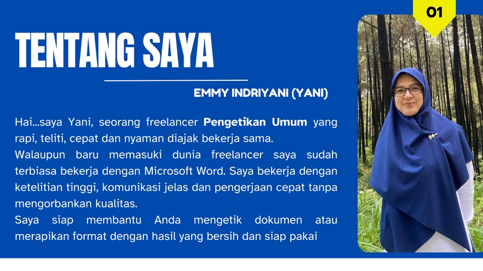 Hi..Salam kenal saya Yani, seorang Ibu Rumah Tangga yang juga seorang freelancer dengan minat pengetikan dan input data. Saya menawarkan layanan pengetikan dokumen dan input data untuk berbagai keperluan. Saya siap menyelesaikannya dengan rapi, tepat waktu, dan bisa disesuaikan dengan kebutuhan Anda. Jika Anda membutuhkan seseorang yang bisa diandalkan, saya siap membantu