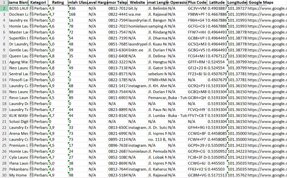 Butuh data bisnis dari Google Maps tanpa ribet dan buang waktu? Saya siap membantu mengumpulkan data bisnis yang Anda butuhkan secara cepat, rapi, dan siap digunakan. Saya menyediakan layanan Google Maps Data Scraping untuk berbagai kebutuhan seperti riset pasar, lead generation, hingga analisis kompetitor. Anda tinggal tentukan kata kunci dan lokasi, sisanya saya yang urus. Data yang bisa diambil: ✅ Nama bisnis ✅ Alamat lengkap ✅ Rating & jumlah ulasan ✅ Nomor telepon ✅ Jam operasional ✅ Website (jika ada) Hasil yang Anda terima: ⚫ File Excel (.xlsx) atau CSV (.csv) ⚫ Data bersih dan terstruktur ⚫ Mudah langsung dipakai untuk analisis atau marketing Kenapa pakai layanan ini? ✔ Hemat waktu riset ✔ Data sesuai kebutuhan Anda ✔ Cocok untuk UMKM, agency, maupun riset pribadi ✔ Komunikasi santai tapi jelas Kalau masih ragu atau ingin tanya dulu, silakan chat sebelum order. Kita bisa diskusikan kebutuhan datanya biar hasilnya benar-benar sesuai.