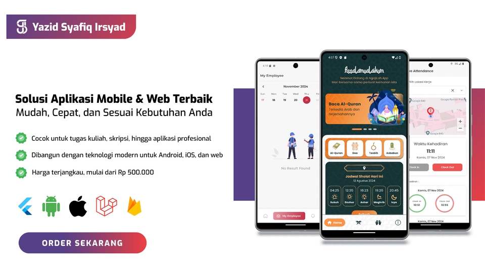 Rp5,0 jtEnterprise mencakup semua kebutuhan: desain, slicing UI, integrasi API kompleks, dukungan penuh & 7 revisi untuk aplikasi siap pakai.