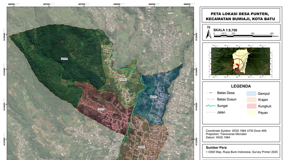 Peta dusun menunjukkan batas-batas wilayah terkecil dalam pemerintahan desa, biasanya mencakup: Batas dusun Nama dusun Jalan utama dan jalan kecil Titik penting (sekolah, balai desa, masjid, posyandu) Lahan pertanian, permukiman, sungai, dll
