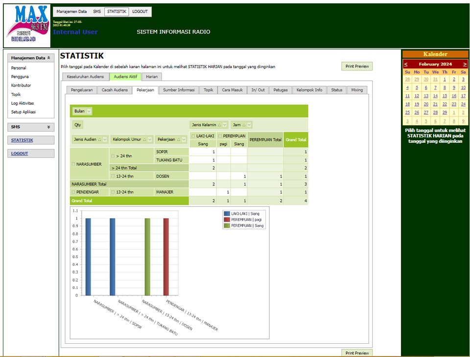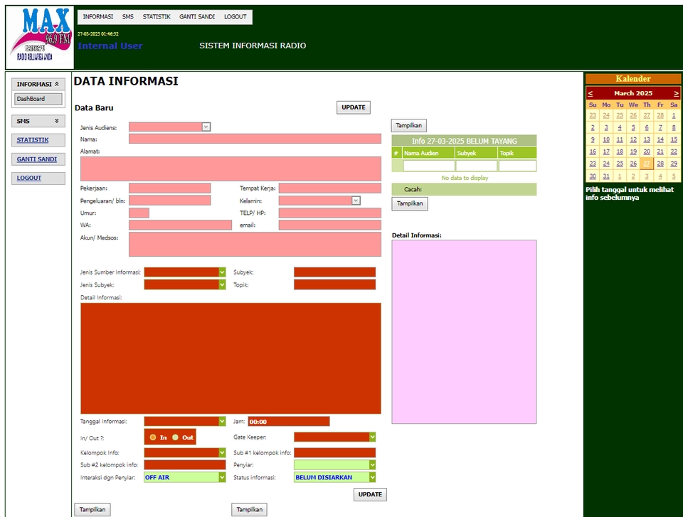 Aplikasi Database Online berbasis Web untuk mengelola Sistem Informasi manajemen Radio FM. Menyangkut pengelolaan Penyiar, Staf, Kontributor, Nara Sumber. Dilengkapi dengan Evaluasi Statistik secara grafis dan tabulair. Statistik terkelompokkan menjadi 3 katagori utama yaitu: 1. Statistik Audiens Harian 2. Audiens aktif 3. Keseluruhan Audiens Masing-masing terbagi lagi menjadi: 1. Biaya Pengeluaran 2. Pengeluaran 3. Pekerjaan 4. Pekerjaan 5. Topik 6. Cara Masuk 7. In/ Out 8. Petugas 9. Kelompok Info 10. Status 11. Mixing: a. Pengeluaran / bulan, b. Cacah Audiens Data masuk ke sistem melalui: 1. SMS 2. Chat WA / Telegram/ lainnya 3. Email 4. Panggilan Telepon Dapat diinstall di server online (internet) atau pun server local (intranet) Langkah Pekerjaan 1. Diskusi dengan klien dan mempelajari Spesifikasi Kebutuhan Software terkait 2. Kustomisasi produk jika ada tambah kurang 3. Menginstall seluruh softwarer sesuai spesifikasi di dummy server dan meminta klien untuk mencoba 4. Menunggu keputusan klien menerima secara penuh 5. Menyelesaikan proyek dengan bukti dokumen UAT (User Acceptance Test)
