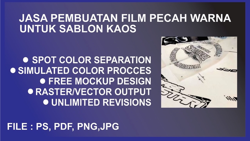 Rp450,0 rbPecah warna spot Ukuran desain sesuai request Spot + Simulated (Mix) Trapping, overprint, halftone Raster/vektor sesuai kebutuhan Free mockup desain kaos Unlimited revisions File: PSD, PDF, PNG, JPG